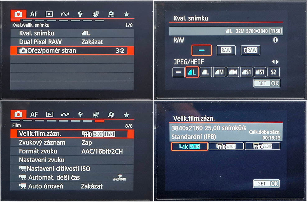 BOMBASTICKÉ MENU co do rozsáhlosti nabízených funkcí...! Optikou „Poučeného Canon PowerShot V1 s nasazenou kožešinkou proti větruModrá ČTVEŘICE podnabídek z ze skupiny přehrávání...laika“ chci vypíchnout Fičury, nevídané v amatérských mašinkách. I když jsem se snažil o „leporela“ čili sestavy VĚTŠINY nabídek STROJE naší Fotodokumentací, zmíním pár extras. V ČERVENÉ SKUPINĚ a tam v první podnabídce je odrážka Dual Pixel RAW, ve druhé pak co pátý řádek ND filtr (Vyp/Zap), což u foťáků také není běžnou funkcí (ano, zrovna kolega Canon PS-G7X MIII ji má). Třetí podnabídka obsahuje mj. položku Barev. prostor (možnosti sRGB nebo Adobe RGB) a níže je pak Snímání v HDR (PQ) a Režim HDR…