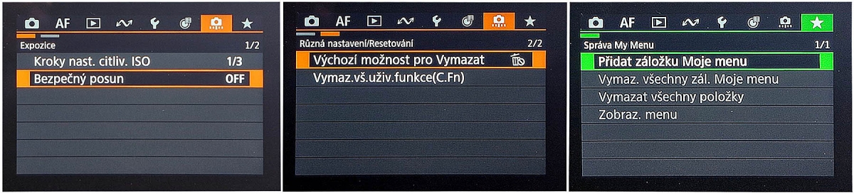 MODROU SADOU (symbol PLAY a 4 podnabídky) pokračují povely k ochraně snímků či mazání, pro formát RAW a Zelená hvězdička vpravo je poslední položkou v MENUfiltry, k prezentaci; a pak Přizp. displej, kde stojí určitě za zmínku Indik. přesvětl., což je dle všeho indikace přepalů čili Zebra. FIALOVÉ TRIO obsahuje bezdrátová spojení s chytrými zařízeními nebo k dálkovým ovládáním, má celkem 3 skupinky, z nichž možná málokdo u nás v ČR využije "Načtení dat pro kontinentální Čínu" a ve 3. kartě se dá "Vymazat nastavení komunikace". OKROVĚ-ŽLUTÉ zbarvení má montážní klíč s obecnými volbami (čas, jazyk, jednotky, tón, hlasitost, jas atd.), když v páté skupině je Nastavení ventilátoru chlazení, "Zasunutí objektivu" či úspora energie (dodatečné foto je poznat)...