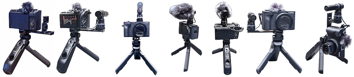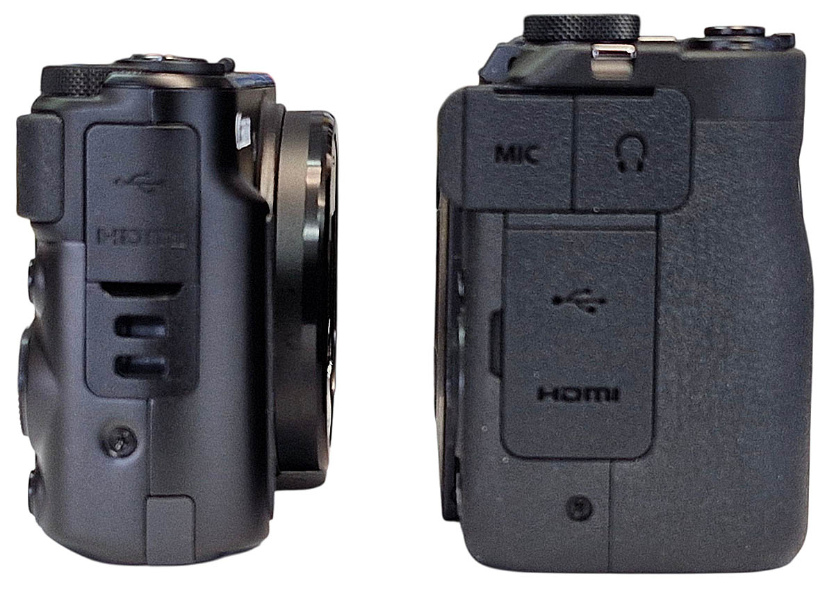 Jestli je Canon PowerShot V1 nazýván „Výkonnou kapesní Videokamerou“ (čs. Web producenta), přiznejme mu alespoň částečnou logiku pro Mikrofonní zdířky: pravobok V1 a levá strana G7X MIIItakový výraz. Oproti kompaktním fotoaparátům - byť je zařazen v této kategorii na Webu výrobce - totiž zjevně NEMÁ omezení záznamu videa na 29´ a 59“ co do délky trvání jednoho souboru! Diference PS-V1 vůči cenově dostupnější SX740ce nebo cenově podobné G7XMIII, přehledně ukazuje přiložená tabulka. VELMI podobné míry kompaktnějšího dua proti dnes představené VÉ1čce; i rozdílné hmotnosti; a v neposlední řadě nestejná konektivita, v tabulce JSOU…