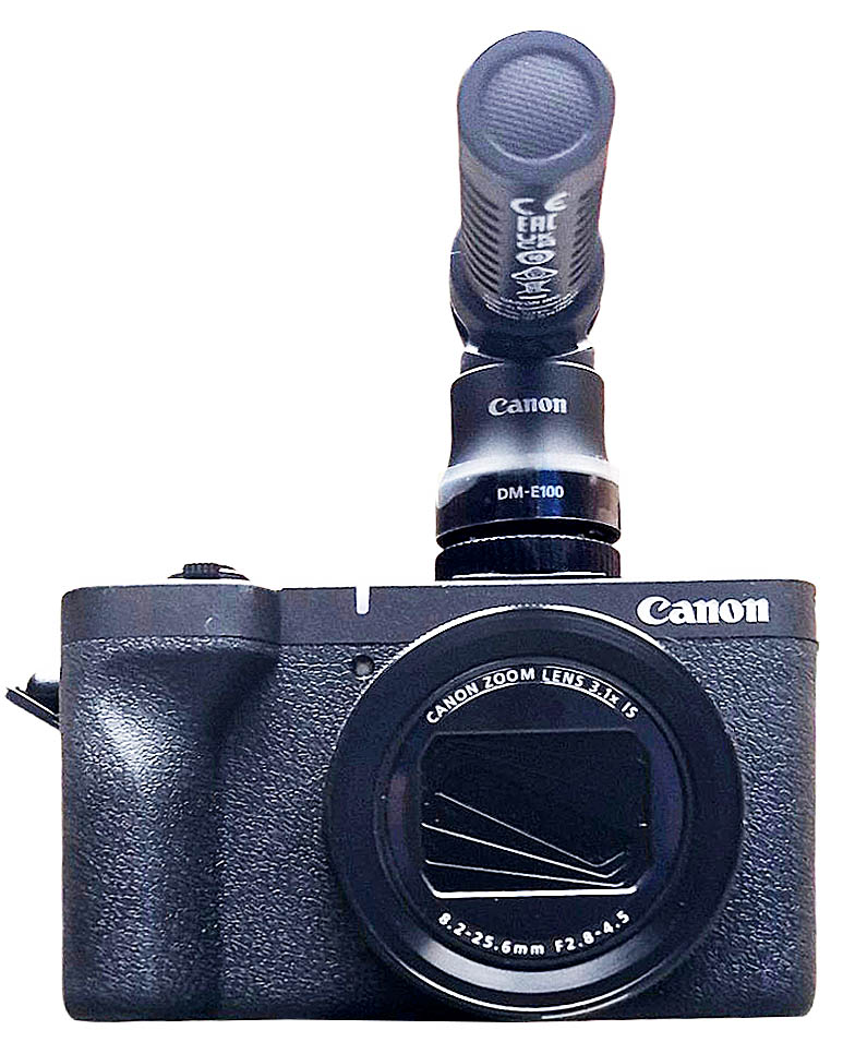 GRIP coby stolní trojnožka HG-100TBR s doplňkovým příslušenstvím a BT-spouští. Měl jsem tuhle libůstku v parádě i Firemní mikrofon Canon DM-E100 a Fotoaparát PS-V1...s foťákem pro předvedení s VÉJEDNIČKOU, ale nějak nešla spárovat a dle návodu možná vůbec nejde. Přikládám do dnešního Castingu náznak, JAK to vypadá a jak by to mohlo fungovat; a současně se slibem, že když se dozvím víc, šoupnu to sem na vědomí. Další libůstkou je firemní mikrofon DM-E100. S tím mašina funguje ukázkově a hlavně se tato É-stovka nepokusí o mdloby při placení. Pro použití externího mikrofonu doporučuji všem uživatelům kontrolu pomocí sluchátek do patřičné zdířky. Stačí nejlevnější ušátka, která se cestovateli omylem zapomněla v brašně s technikou, když jel tuhle Studentem a podobně... Nevinný