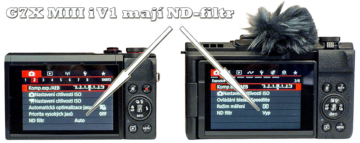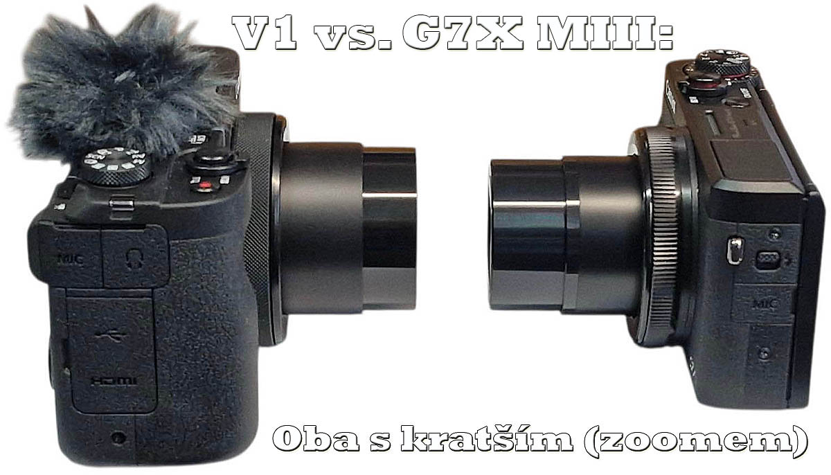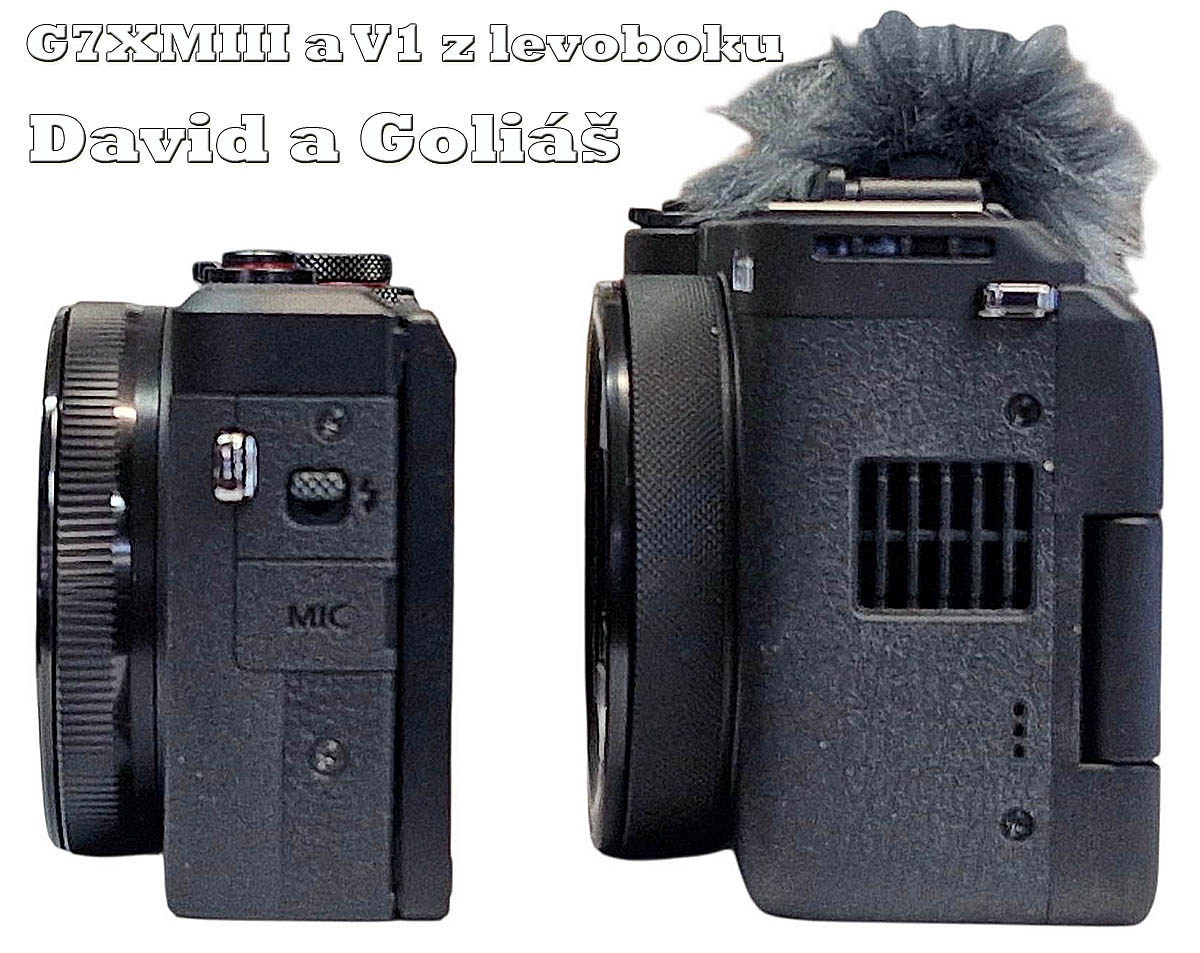 Měli jsme teď zrovna štěstí, že k nám z rozdělovníků přicupitalo trio G7X MIII. Takže jsme nelenili a udělali pár ČTYŘI z podnabídek z červené skupiny: kvalita Foto-Video Canon PS-G7X MIII versus PS-V1 v bočním detailu...srovnávacích momentek i s tímto často uvažovaným kolegou. Je patrné, že PS-V1 je FAKT VÝRAZNĚ masivnější a vedle vcelku subtilní Sedmičky může působit asi jako americký svalnatý OF-ROAD oproti útlé evropské verzi. Absenci vestavěného blesku už jsem zmínil, ALE výklopný, otočný a překlopný displej HOVOŘÍ značně PRO tento STROJ: čili nepřímo odčiňuje „Bleskový exces“. Kožešinka jakési protivětrné ochrany mikrofonů sice trošku zavazí ovládání hlavního vypínače, ale to se dá rychle nahmatat. Podobně jako modelu G7X MIII nechybí PS-V1 mikrofonní zdířka, ale masivnější STROJ ji má na pravém boku...