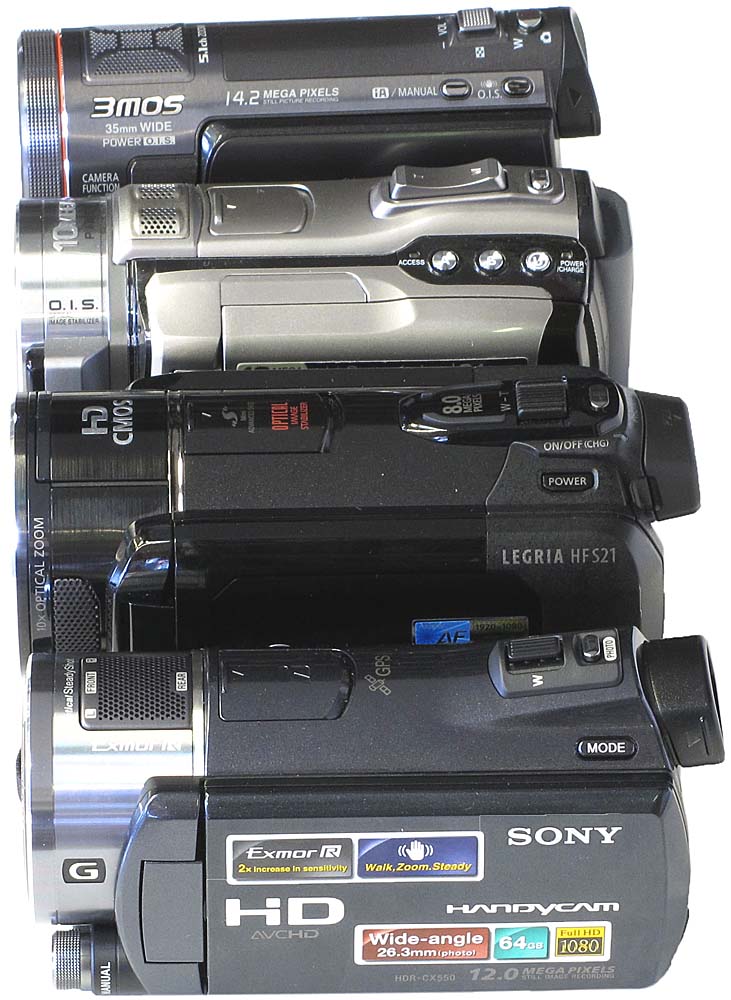 Snímač. Největší CMOS-čip má ve svých útrobách JVC HM1 (1/2,3“ a 10,6MPx) o malý chloupek před HF S21 (1/2,6“ a 8,6MPx), za nimiž se bez krčení vezou Sony (1/2,9“ a 6,6MPx) a čtvrtý Panasonic se třemi 3MOS-senzory s 1/4,1“ a tudíž 3x 3,05MPx. Na tomto místě musím přiznat, že jsem přepracoval s pomocí kolegy Jana část textu tohoto odstavce. Z původní úvahy, že bych plochy snímačů počítal pouze jako čtverce a vycházel z jejich úhlopříček, jsme došli k názoru, že pomocná tabulka na čipy s (předpokládaným) formátem 4:3 bude výrazně přesnější - nutno doplnit, že chyba od čtvercové plochy vycházela pouze na necelá 4% „shora“. Do XLS-vzorečků jsme si dosadili správnou logiku mocnin a odmocnin a pak už tam jen sázeli úhlopříčky senzorů. Největší plochu pak má JVC se sběrací kvadraturou zhruba 58 mm2, následují Canon s asi 46 mm2, Sony s cca 37 mm2 a Panasonic pak se zhruba 3x 18 mm2, tj. celkem asi 54 mm2. Nejen zahrádkáři a stavebníci asi znají onu pomůcku, jak si na zahradě (stavbě) nakreslit pravý úhel s použitím trojúhelníku o délkách stran 3-4-5 m (30-40-50 cm), kdy plochy čtverců nad odvěsnami (9 a 16 m2) dají v součtu právě onu mocninu pěti (přepony). Naše vyladění spočívá pouze ve správném poměru, který tvaruje původně uvažovaný čtverec. Z posledních dejme tomu 10 let je v éteru už tolik krkolomných metodik, jak na výpočet velikostí čipů, že nabízím tuhle (naši). Schválně, jestli vyšlo i čtenáři, že např. 1/6“ snímač má asi 8,6 mm2 plošky pro sběr dat a třebas 1/3“ čip pak cca 34,5 mm2? Co do velikostí čipů jsou tedy karty rozdány, by jde o pomocný údaj…