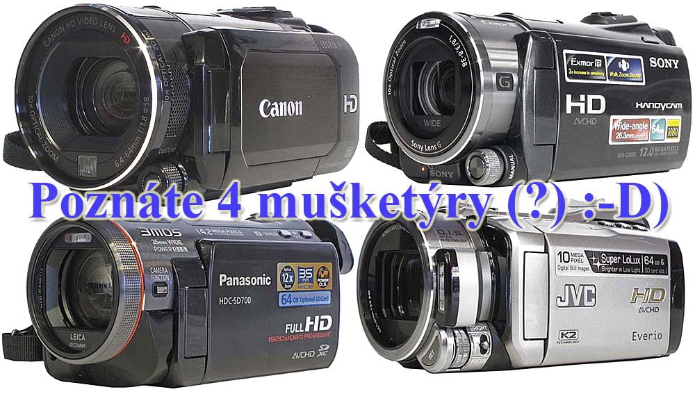 Ještě přidám vsuvku. Na začátku úvah, jak budeme s kolegy z firmy Videokamery CZ vůbec postupovat v (čtenáři tak žádaném) hodnocení a porovnávání TřÍ mušketýrů v počtu čTYř udatných, bylo jednoduché rozdělení. Každý model z posuzované čtveřice dostal něco do vínku od výrobce - to budou ona TECHNICKÁ DATA - a každý strojek obdržel nějaké stupně výkonů a výkonností: to zahrneme do slova SROVNÁNÍ čili TEST. Vlastním zkoušením chceme přijít na to, jak snímají mašinky denní a (hlavně kvůli čtenářům :-D) šeré scény, včetně detailů v nejvyšších módech kvality videa, jak se dokážou vypořádat s nástrahami rychlého pohybu (i se svými extra-funkcemi), jak zvládnou jednotlivé scény v automatu a co případně zmohou po manuálním ovlivnění. Vzhledem k deklarovaným kvalitám dalších vymožeností se podíváme i na to, jak si stojí v reálných FOTO-schopnostech; a chtěli jsme tu uvést i všechny případné výjimky z nepsaných pravidel: jako třeba méně účinnosti stabilizace a podobně. MÍSTOPřÍSEŽNě prohlašujeme, že jsme popisované kamery testovali s nejlepším svědomím, bez nadržování (žádná to jistě nepotřebuje) a hlavně bez záruky, že testovaný kus nemohl být (ale NEMěL by) mimo toleranci výrobce…