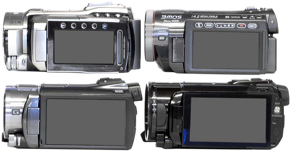 Hledáček. Fenomén kameramanského řemesla měl odnepaměti k dispozici nějakou z forem té či oné varianty hledáčku. Moderní trend amatérských modelů kamer sice nyní velí vynechat tenhle důležitý díl výbavy stroje, ale všichni asi uznáme, že na slunci je vidět na velkém displeji fakt houbelec a krom jiného se uvádí, že kamery mají s miniaturní obrazovkou zhruba o 30% nižší spotřebu energie z akumulátoru. Absencí hledáčku prohrává tuto disciplínu o 2 koňské délky JVC, zatímco další soupeři se zvláštně zbavují možnosti vyhrát jednoznačně. Zatímco Sony je s 201,6kPx nejostřejší obrazovkou v hledáčkovém okuláru (ale pouze s 0,2“ displejem), Canon i Panasonic mají shodnou úhlopříčku obrazovečky 0,27“, ale také shodně s pouhými 123kPx. V praxi se tato data projevují malým šokem z pravosti displejíčku Sony a přehledným pocitem z obou displejů s méně obrazovými body. Ovládací prvek regulace dioptrií dle stavu točičova oka (dvakrát mi to Word upravil na „topičova“ :-D) je stejně titěrný u všech tří typů, výjimku tvoří pouze JVC, kde toto hejblo logicky zcela chybí. Holt chudáci majitelé RJL (naše Rukou Jako Lopaty), nemají na růžích ustláno…