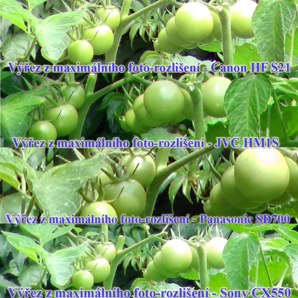 Galerie ukázek Fotografií: neboli opětovná demonstrace širokoúhlých schopností s přídavkem porovnání šumu v plných detailech. Nejdříve se musím přiznat, že pro tento odstavec mi nešly dodržet shodné podmínky pro všechny snímky, protože honit ten den slunce do scény se jaksi nedařilo (bylo VELMI neposlušné :-D). Povedenost fotek a závislost na úhlu osvětlení zjevně ovlivňuje stejnost obrázků, ale výkonní mušketýři si své eventuální nedostatky doženou v jiné stati tohoto povídání. Zleva doprava je tu na střídačku plně odjeté a plně najeté trafo čili ZOOM našich jednotlivých strojů. Canon se na WIDE-celku staveniště (bohužel) nejeví nijak širším v záběru proti JVC, ale ještě markantnější je posunutí scény recenzentovou nedůsledností. Sony opět vítězí svou širokostí o koňskou délku před 700vkou a Canon s JVC se stran těchto schopností kapku krčí vzadu. Jako názorný bonus přikládám srovnání širokoúhlých snímků ve zmenšené velikosti 2000x1500, jež demonstruje obrovský rozdíl mezi prvním a posledním v soutěži na téma WIDE a nadto druhý bonus, kde porovnávám výřezy z maxima rozlišení od jednotlivých účastníků naší konference - jde o (doufám zjevně podobný) detail rajčat, jež jsem přiblížil na plný ZOOM ze stativu na jedné zahradě…