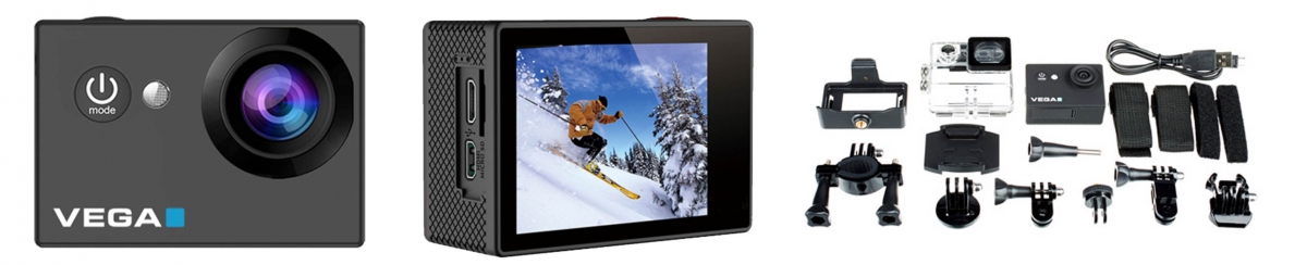 Niceboy ® VEGA je nejlevnějším modelem z portfolia výrobce nabízí FullHD interpolovaný (slavný odkaz českého Internetu Smějící se) záznam při 30 snímcích, další volbou je HD a VGA také při 30 snímcích. Záznam je ve formátu *.avi a fotografie klasicky v JPG s maximálním rozlišením 12MPx. Zadní straně dominuje 2 palcový displej. Akumulátor má kapacitu 900mAh, nabíjení se provádí v kameře cca 3,5 hodiny (přes micro-USB) a kamera s ním vydrží asi 80 minut práce. Obrazový procesor nese označení Sunplus. Objektiv má šířku záběru 140°. Maximální velikost paměťové karty je 32GB. Kamerka váží 58g (!) včetně akumulátoru. Rozměry 5,9 x 4,1 x 2,4 cm, ve vodotěsném obalu (do 30m) pak 7,9 x 6,5 x 2,6 cm. VEGA je schopna nabíjení i během záznamu. Díky možnosti cyklického záznamu je možné ji použít i jako tzv. palubní kameru...