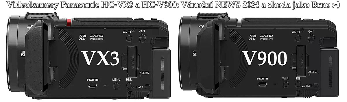 Jsem konečně u ZBRUSU NOVÝCH Videokamer. Zatím není ani v distribucích jasné, kdy se objeví v maloobchodě Videokamery Panasonic X3 a V900: srovnání zprava... (UŽ je avízo v začátku prosince), ale máme produktový list DVOU novinek Panasonic, jakožto číselně logicky nazvaných HC-V900 (Full-HD) a HC-VX3 (4K) < 2x odkaz na český Web značky. Typem, rozměrově, esteticky i hmotností zcela shodné modely konzervativních tvarů vychází zjevně z předchůdkyň a co do designu nepřináší nic, čím by oko potěšilo, ale ani urazilo. Černá těla téměř identických dvojčat, jež mají společné skoro vše až k návdavku v podobě 4K, přičemž obě chodí (pomyslně) do stejné školy, respektive mají viditelně stejné ovládací prvky. Hledání rozdílů stagnuje (opět šup berličku Nevinný) AŽ…
