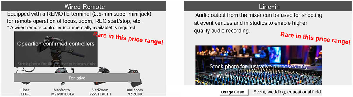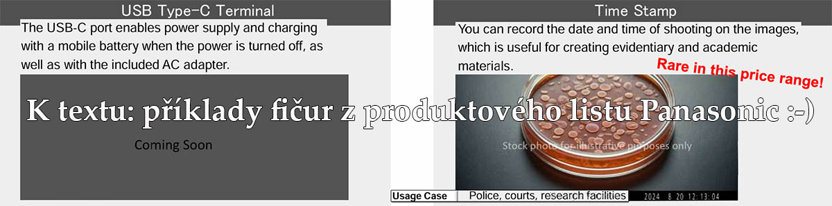 Jděme na největší FIČURY (jak říkával kolega NEFF Usmívající se). Zřejmě prvním a jistě NEJVĚTŠÍM rozdílem je víc než Ukázka EXTRA funkcí z Produktového Listu Panasonic...trojnásobný počet pixel na vylepšených displejích. Přesně 1,555.200 bodů oproti 460.800 na shodné úhlopříčce s předchůdkyněmi, tedy 3“ neboli 7,5 cm. U informace o USB-C píšou „Coming Soon“ (pobavilo) a u dalších EXTRA píší v produktovém listu, že jde o vzácnost v této cenové třídě. Jde o razítko data, zdířku LANC, možnost záznamu zvukových stop s výrazně vyšší kvalitou (věrností) připojením kamery k AV-pultu: a Panasonic přidává i další důkazy pokroku a vylepšení svých Videokamer. S tou "Zdířkou LANC" je to ovšem tak trošku informační šum, ale to probereme v RECENZI …