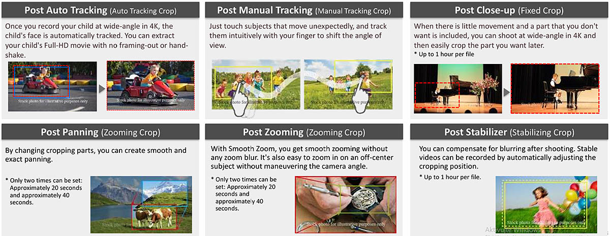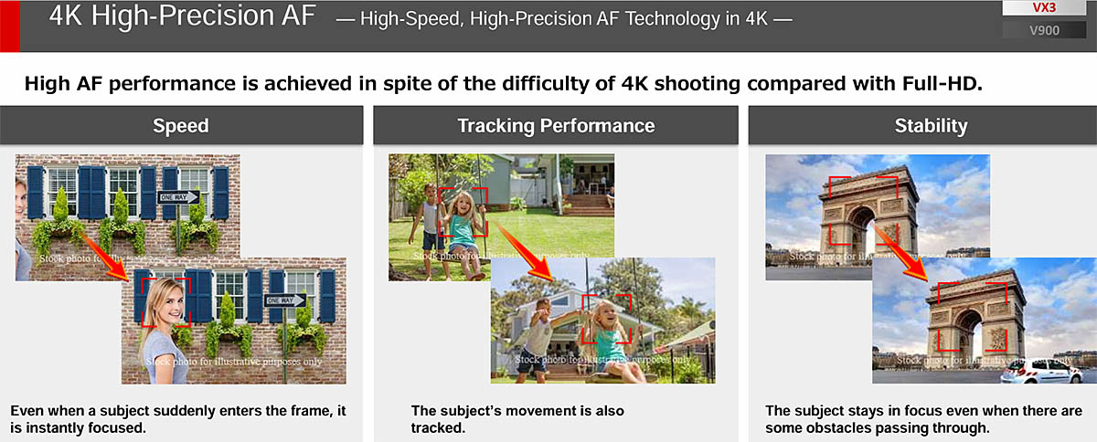 Je tu celá řada (doslova) VYMOŽENOSTÍ, kterými oplývá minimum konkurenčních kamer a které bývají spíše Ukázka EXTRA funkcí z Produktového Listu Panasonic...doménou „AUTDŮROVÝCH“ specialit typu Osmo POCKET a podobných libůstek. Popořadě dle NÁZORNÉHO screenu z produktového letáku: je tu SPEED, čili „senzor pohybu“, který má RYCHLE zaostřit např. na nový subjekt, který se náhle objevil ve scéně, dále pak  TRACKING PERFORMANCE - neboli SLEDOVÁNÍ objektů s jejich pohybem, následuje STABILITY coby „blokace“ ostření, i když skrze scénu projde rušivý objekt a následují další vymoženosti, pro které jsme stvořili „PRINTY“ z PDF-letáku o novinkách, aby si čtenář mohl udělat svůj názor anebo dostat chuť na jednu z novinek…