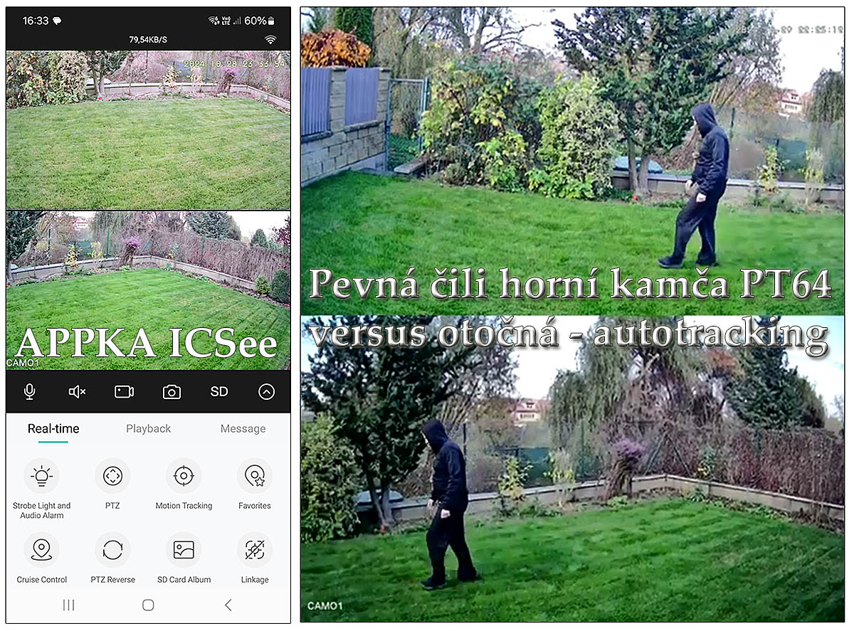 Takže PT64 má opět cosi EXTRA a SQĚLE (krásný český přesmyk Mrkající) to vynikne v Aplikaci ICSEE, která ji právě Okna aplikace ICSee: horní stacionární a dolní otočnápřísluší podle prvních tří písmen v názvu. Horní okno v náhledu zobrazuje zmíněný záběr z pevné kamery (horní) a dolní okno pak logicky z té variabilnější neboli otočné. Spřízněný muž Jirka v jedné osobě coby dodavatel této značky pomohl našemu časovému presu a zaúčinkoval mi v demonstraci právě oné spolupráce obou kamer tak, že dolní otočná sleduje osobu (pomyslného) lumpa v kapuci svojí geniální funkcí AUTOTRACKING. Při editaci klipu s oběma okny jsem nakonec zvolil export s poměrem 720 krát 720 bodů, protože jinak mi to video vycházelo úplně zdeformované…