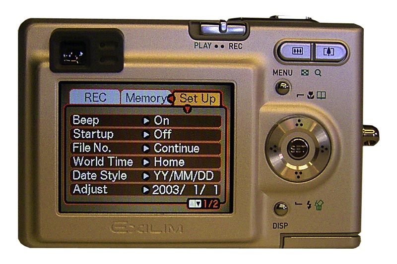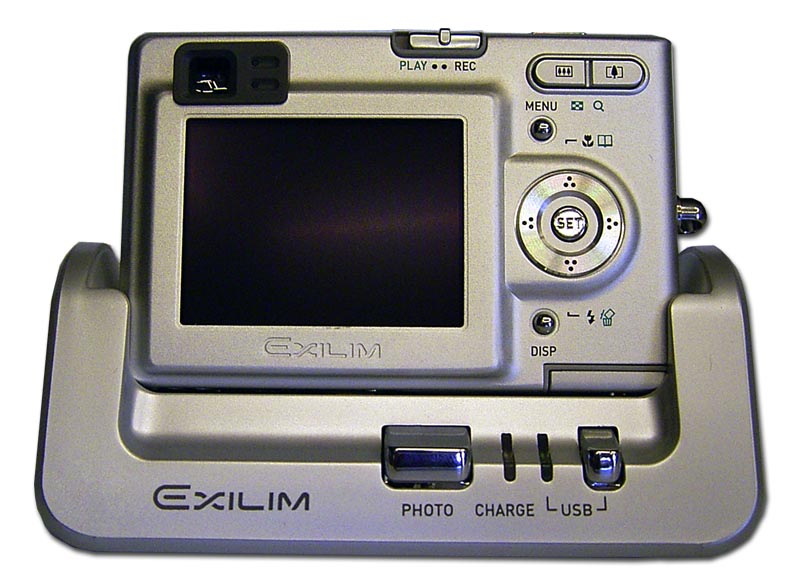 Dalším kladem EX-Z3 - asi nejnápadnějším na první pohled - je velký zobrazovací monitor s úhlopříčkou 51mm. Jde snad o největší LCD-panel u takto malého přístroje. V základní výbavě nenajdete (stejně jako u Pentax-Optio S) paměovou kartu, jelikož je zde vestavěná pamě (11MB). V nejlepším rozlišení na ni uložíte až 7 fotografií. Je tedy vhodné dokoupit paměovou kartu, nejlépe typu SD. Lze sice sehnat stále ještě i MMC, ale tato má omezenou kapacitu a navíc jde čím dál hůře sehnat. Další funkce fotoaparátu je COUPLING Shot, jež umožňuje sloučit 2 samostatné snímky a vytvořit jeden. Jelikož je fotoaparát tak malý (rozměry jsou 87x67x23mm), že na něm nejsou umístěny žádné výstupy (USB nebo AV), výrobce přiložil praktický stojánek - tzv. dokovací stanici - která funguje současně i jako nabíječka a má na sobě také např. výstup do USB-portu počítače (viz o dva obrázky výše)…