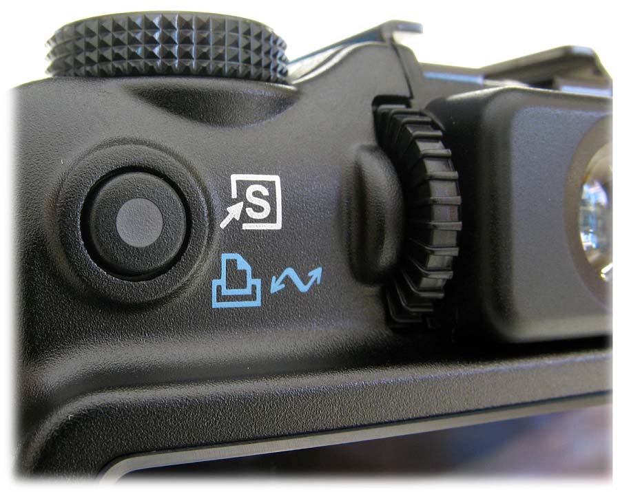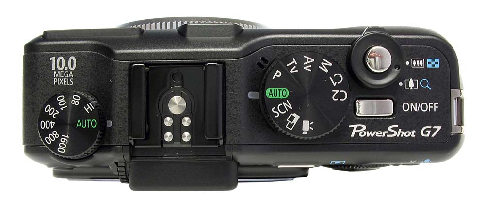 Ovládání přístroje bych hodnotil v této třídě výkonných kompaktů za nadstandardní a velmi příjemné. Jelikož se předpokládá, že si daný foák vybere spíš uživatel, jenž má už nějaké zkušenosti s focením a hlavně bude chtít zkoušet více věcí nastavovat v manuálním módu, je tělo přístroje poseto tlačítky s konkrétními funkcemi. Osobně bych tu vyzdvihl hlavně sólo tlačítko pro přehrávací režim. Na horní straně těla je hlavní vypínač, tlačítko spouště obemknuté páčkou ovládající ZOOM, dále volič foto-režimů vč. módu nahrávání videa a na druhé straně volič citlivosti ISO (Auto, Hi, 80, 100, 200, 400, 800 a 1600). Navíc je zde umístěna patice pro externí blesk. Hned vedle voliče fotografických režimů je skryt jeden mikrofon (zvuk je tedy nahráván monofonně). Kolečko voliče má 10 záznamových režimů: Auto, P, Tv, Av, M, C1, C2, SCN, Panorama a Video…
