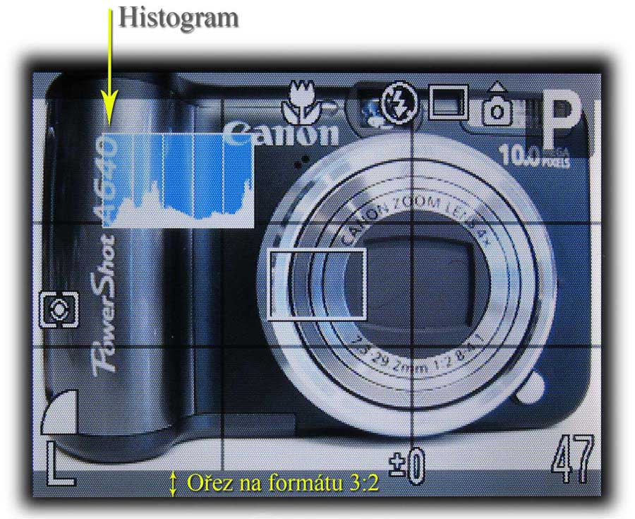 Na čtyřcestném ovladači jsou volby nastavení režimu blesku (automat a stabilně zapnutý nebo stále vypnutý blesk), MAKRO režim, samospouš (v MENU ji lze nastavit od 1 do 30s), sekvenční fotografování a manuální ostření, které je na velmi solidním LCD panelu vcelku přesné. Pod tlačítkem FUNC. jsou ukryty možnosti nastavení VYVÁŽENÍ BÍLÉ BARVY (7 přednastavených možností plus manuální vyvážení), dál je tu volba MÉ BARVY s možností změny charakteru fotografovaného snímku (živé, neutrální, černobíle, sépie, atd.). Jako další má Canon i funkci BKT, která funguje ve třech krocích s různým nastavením expozice (AEB) či zaostření, takže jeden snímek přístroj vyfotí ve trojím vyhotovení. Je zde možnost nastavení účinku BLESKU (dosah cca. 4 metry) a také tři REŽIMY MěřENÍ (tj. poměrové, celoplošné se zdůrazněným středem a bodové). Další položka pak umožňuje aktivaci šedého filtru pro focení za slunečného počasí. Dle návodu snižuje intenzitu světla o jednu osminu (3 kroky). Poslední 2 kroky jsou k nastavení KOMPRESE SNÍMKU (super jemný-jemný-normální, ale tady bez možnosti režimu RAW - tedy tzv. nekompresního formátu) a ROZLIŠENÍ, jež dovolí obsluze navolit úctyhodných 6 poměrů stran - 3.648 x 2.736 (10MPx), 2.816 x 2.112 (6MPx), 2.272 x 1.704 (4MPx), 1.600 x 1.200 (2MPx), 640 x 480 (VGA) a jako návdavek i širokoúhlý formát 16:9 s čísly 3648 x 2048 (7,5MPx)…