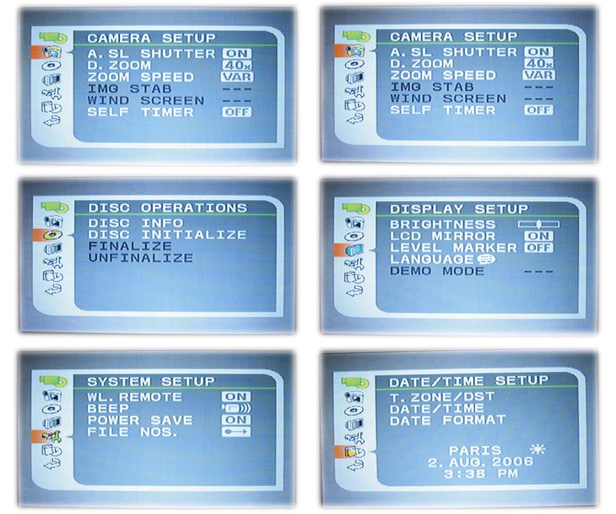 Některé z nabídek videokamery DC40 (Klikni pro zvětšení)