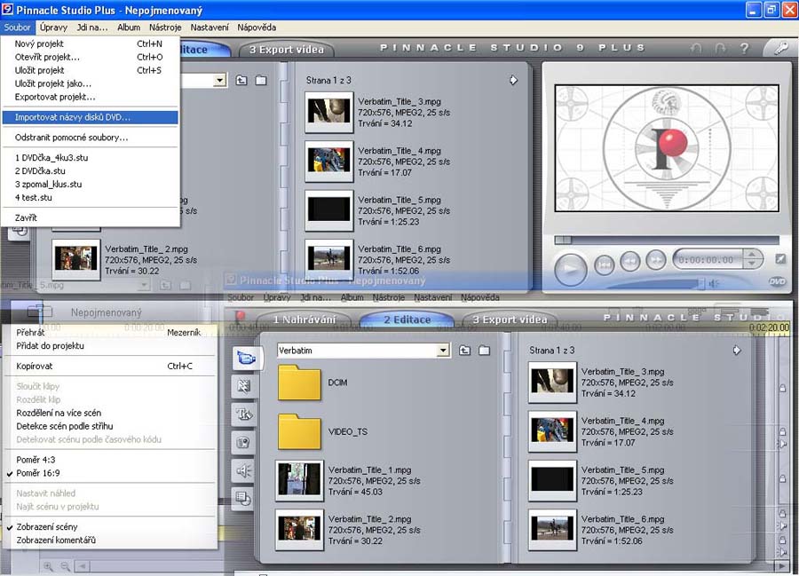 Druhý postřeh se týká číslování souborů - pokud si chce točič po víkendu např. vypálit 3 malé disky 1,4GB na jeden běžný 12cm (obvykle 4,7GB), narazí na drobný problém: na každém 8cm DVD jsou jednotlivé úseky videa číslovány od jedničky. Jak tedy ucelit soubory, aniž by si Pan počítač nechtěl stále znovu přepisovat ony stejně označené klipy? Krátce a jen a jen pro laiky, znalejším tento odstaveček zapovídám a propagátorům jiných střihových SW vzkazuji, že by nebyl dobrý na jejich nervy: pro jakési sjednocení videoklipů ze tří malých disků na jeden velký jsme totiž použili program Pinnacle VS9+. Za volbou editace jsme postupně otevřeli tři obsahy DVD, jež jsme předtím (s)prostě nakopírovali na HDD. V položce Označit názvy pro import jsme vybrali části disků, které jsme chtěli zpracovávat a následně si ještě vybrali mezi poměry 4:3 a 16:9. Další funkce jsou už totožné všem formátům čili typům kódování, ale že to není o půvabu v jednoduchosti, to se musí hned za tepla bonznout. Nech profíci prominou laický popis (já psal, že to nemají číst :-0), ale vzdorovitost DVD-formátů je dokonána: zavírání + otevírání disků (finalizace a opačně) a hlavně dlouhá čekání na všechny reakce a operace přístrojů jsou hotovým očistcem. A ani po konečném uzavření disku není práce s nahrávkou tak pohodová, jak se snaží naznačit dezorientující televizní reklamy nejmenované firmy…
