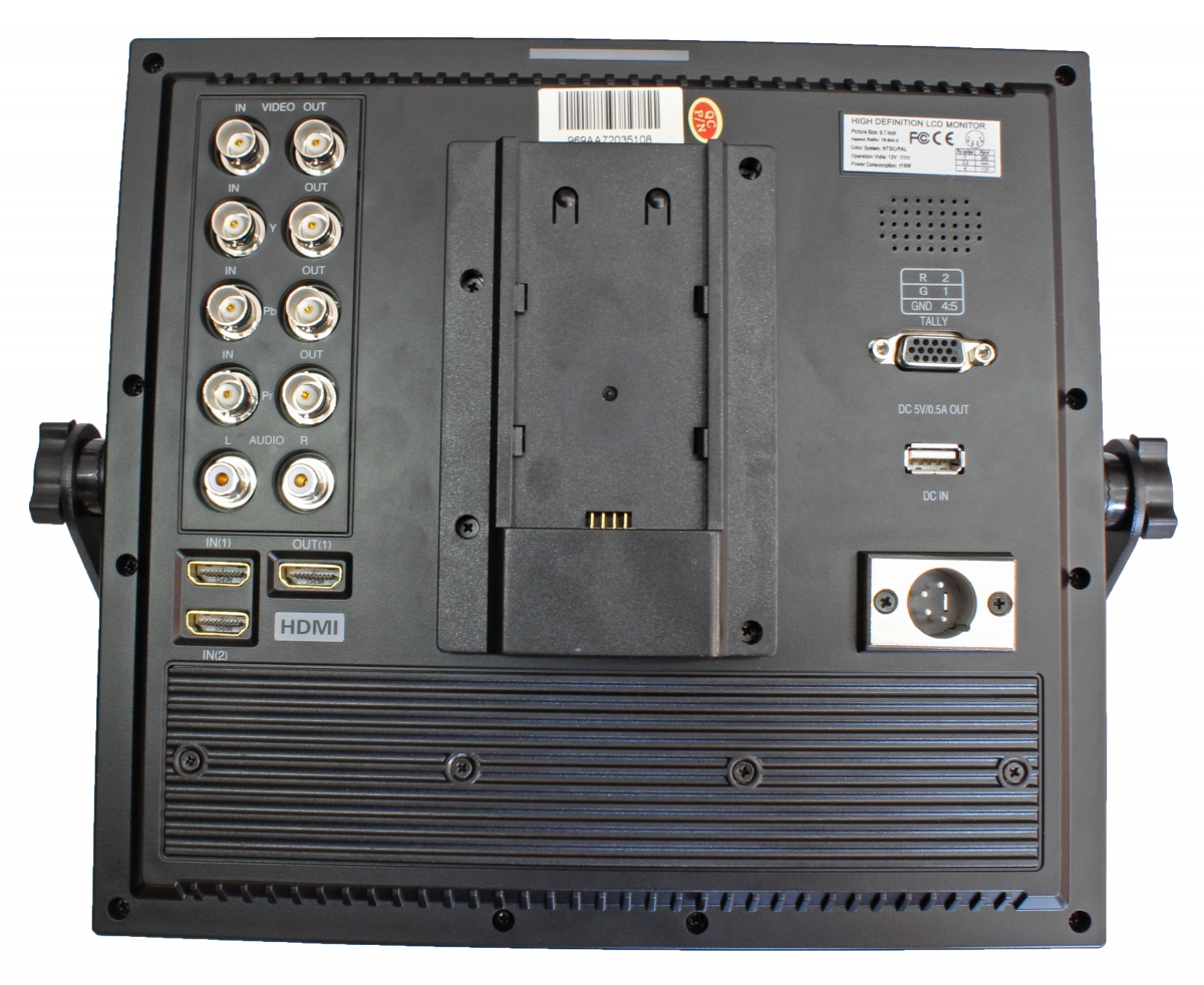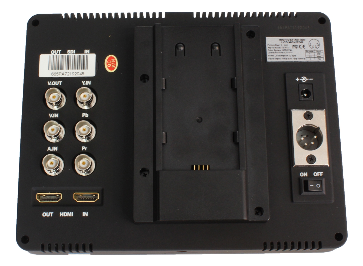 Menší z dvojice přídavných LCD panelů se jmenuje LILLIPUT 665, je vybaven 7palcovým TFT LCD displejem s rozlišením 1024x600px a LED podsvícením. Displej má jasovou hodnotou 250cd/m2 a kontrast 800:1. Jak už napovídá rozlišení, jedná se o obrazovku s poměrem stran 16:9. Deklarovaná hodnota pozorovacích uhlů 160° a 150° se zdá až nepravděpodobná, ale budeme jí věřit (nebo poradíte, jak ji změřit? :-D). 655tka je vybavena množstvím vstupních a výstupních konektorů, jež jsou umístěny na zadní straně. V levé části (viz názorné foto níže pod tímto odstavcem) je šestice starých-dobrých BNC konektorů (či spíše zdířek) s následujícími funkcemi: 1. analogový video-výstup, 2. analogový video-vstup, 3. analogový audio-vstup a pravá trojice (5. 6. 7.) je určena pro digitální komponentní vstupy. Pod těmito speciálními zdířkami je umístěno duo HDMI konektorů, jeden pro vstup a druhý pro výstup (to jsou věci!). Záslepka na obrázku nad BNC-zdířkami zjevně zakrývá možné SDI-zdířky pro dražší verzi monitoru. Displej zvládá přehrávat vstupní signály s rozlišením: 480i/p, 720i/p a nejvyšší mód 1080i/p - a tento pak pouze přes HDMI. V prostřední části je filištínsky umístěn jakýsi konektor pro připojení akumulátorů s pomocí adaptačních destiček. Součástí balení je destička pro aku typu SONY řady F, tedy např. NP-F550 a destička pro připojení aku Canon LP-E6. Sluší se poznamenat, že zatímco patice Sony F/L je nejstarší Li-ION paticí Sony vůbec, označení Canon LP-E6 značí příslušnost k profi- a semiprofi- řadám zrcadlovek EOS...