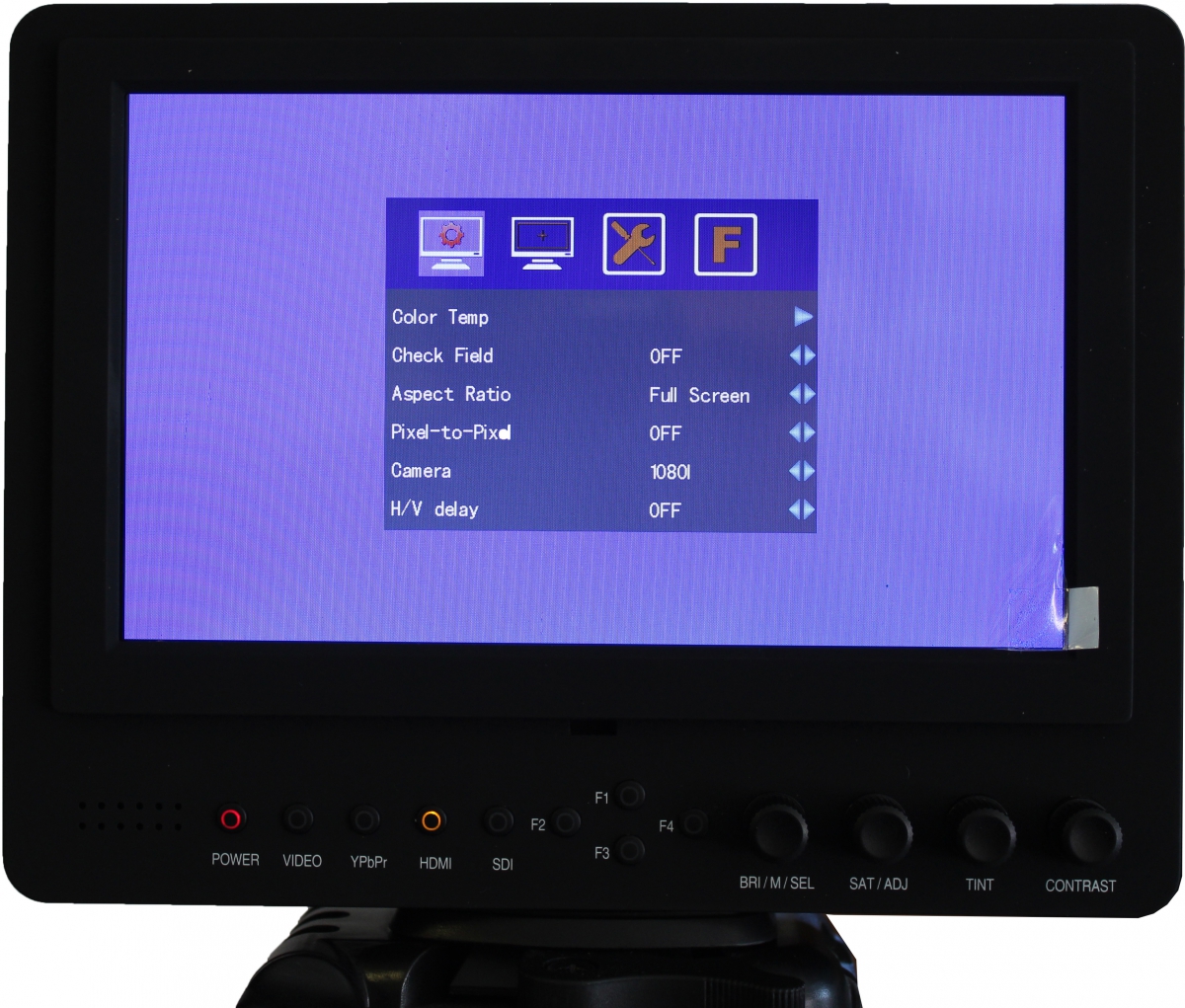 Jak je patrno na snímku zde výše, na přední straně je několik ovládacích a informačních prvků. Prvním z levé strany je tlačítko „POWER“, neboli zapnutí monitoru (citujeme z návodu - "napájení je signalizováno červeným podsvícením"). Následující čtveřice indikátorů s popisky VIDEO, YPbPr, HDMI a SDI (SDI aktuální jen u vyššího modelu vybaveného tímto vstupem) slouží k označení vstupu, ze kterého přijímá monitor signál. Dalšími hejblátky je kvartet funkčních tlačítek F1-F4, ke kterým je možné přiřadit potřebnou funkci, a to podle požadavku uživatele...