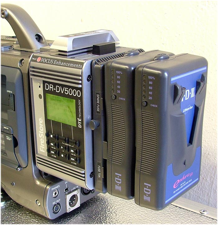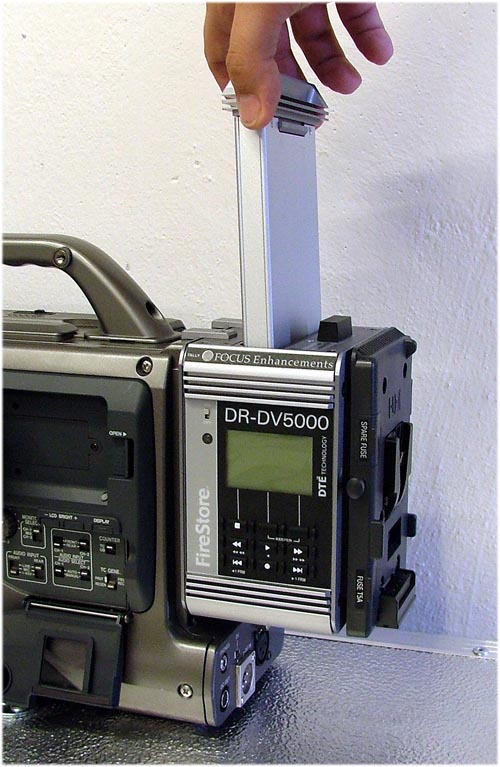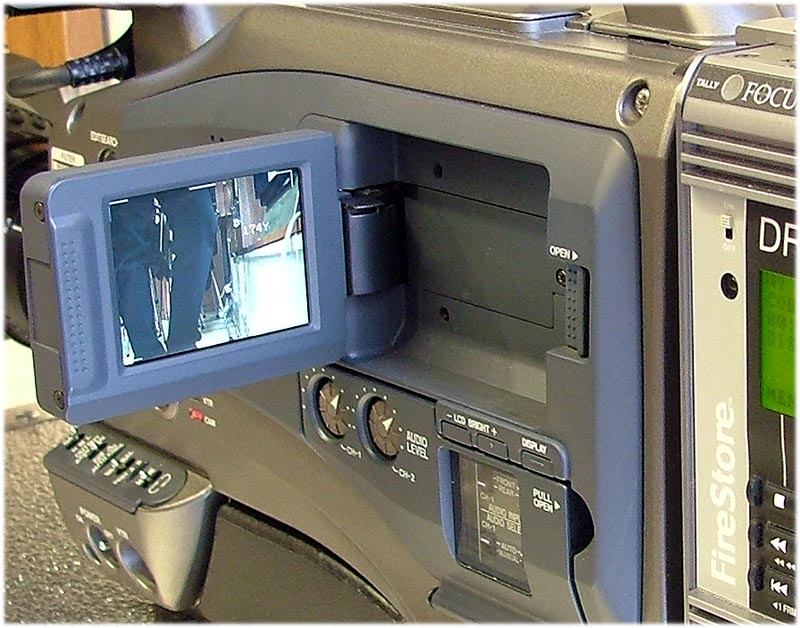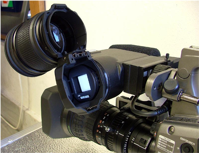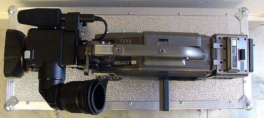 Už první seznámení bylo velmi (!) působivé. Obrovský stříbrný kufr, vybavený kolečky, (odezírat prosím z obrázků) skrýval tohle impozantní zařízení v celé jeho sestavené kráse. Tedy: s nasazeným objektivem i pevným diskem jako záznamovým médiem a taky akumulátorovým pouzdrem. Ne že by tahle kamera neuměla nahrávat na nějaké běžnější médium, ale ten HDD, to je fakt vychytávka No1. Je tu tzv. dvojitá mechanika, do níž lze bez složitých manipulací nebo adaptérů strčit malou mini-DV i velkou kazetu DV (pohled do mechaniky možná napoví). Vzadu zavěšený HDD má udávanou kapacitu 40GB a pro plný DV-PAL to stačí na kousek přes 3 hodiny videa. Než se pustíme do vyjmenovávání dalších nevídaností, uveďme ještě, že popisovaná pětitisícovka je podobně jako většina profesionálních strojoven jakousi stavebnicí: má nasazen a připojen hledáček, mikrofon i odnímatelný objektiv (je značky Fuji a na sluneční cloně má napsáno FUJINON). Nenabízí sice zdvojené ovládání (zespodu a na madle), jako například Canon XL2, ale za to je ramenní mašinou první kategorie s držením pod zápěstním řemínkem pravičky…