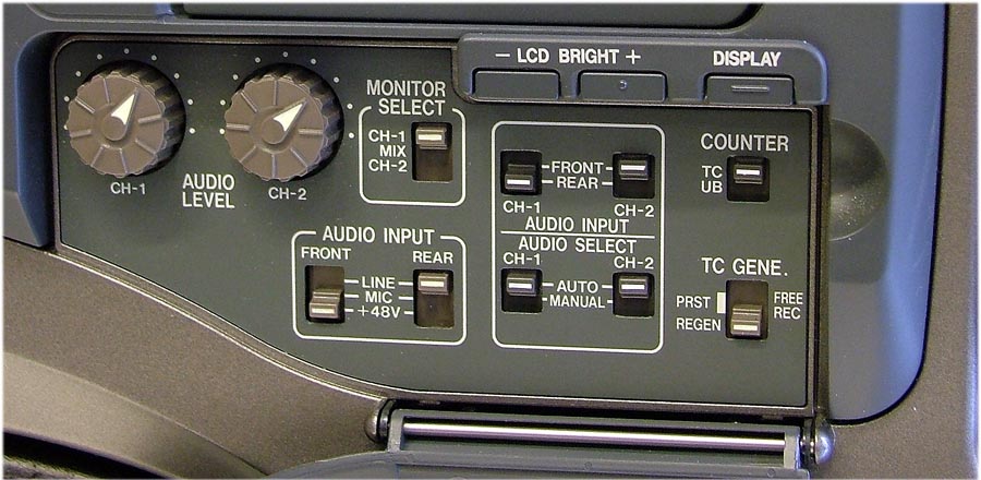 I mechanicky je ohromná mašina vybavena některými prvky, které by si kdekterý kutil možná rád dodělával na svém domácím mazlíčkovi. Je tu například dvojice závitů se stativovým průměrem na horním madle k upevnění dalších doplňků (opět viz obrázek). Mezi opravdu rozsáhlými možnostmi manuálních nastavování nechybí samozřejmý arzenál zvukových páček a točítek ukrytých pod odklopným krytem (obrázek). Dalšími páčkami jsou tu možnosti nastavení zisku a balance bílé barvy, volba rychlosti závěrky a stupně tzv. šedého filtru, možnost indikace přeexponovaných míst (známá zebra) nebo pomocníka k detailům pleti a další. Při vlastní práci se kameraman musí s takovýmto přístrojem podstatně více sžít, než když se např. my můžeme denně prostřídat u několika amatérských mašinek při výkladech kupujícím. Téměř celá hmota spočívá zjevně na rameni a pravičku má obsluhující na výše zmiňované ovládání kolébky přiblížení a (možná) maximálně ještě na drobná vyvažování stroje. Levá ruka bude na tomto typu kamer určitě nesrovnatelně důležitější, než jak to známe z maloobchodních amatérek…