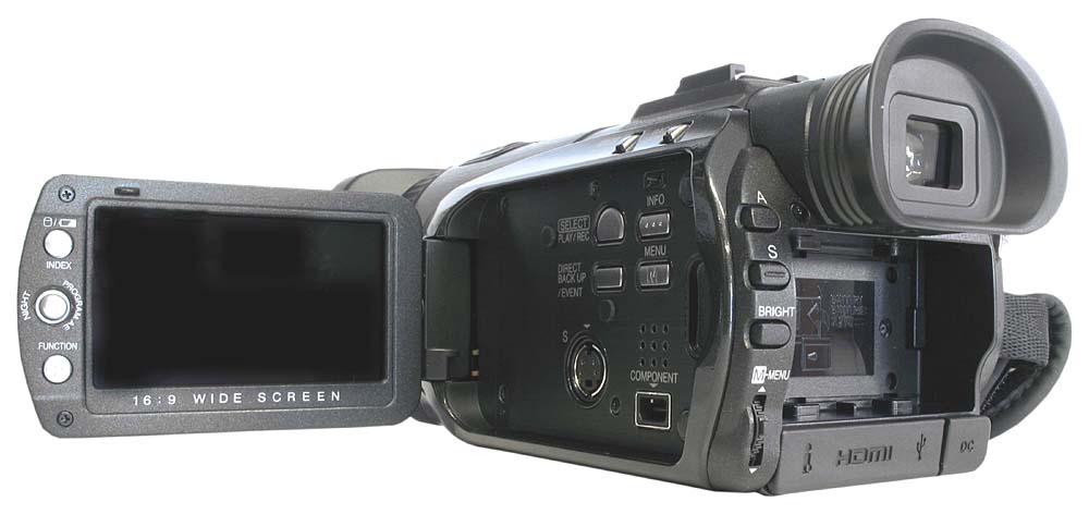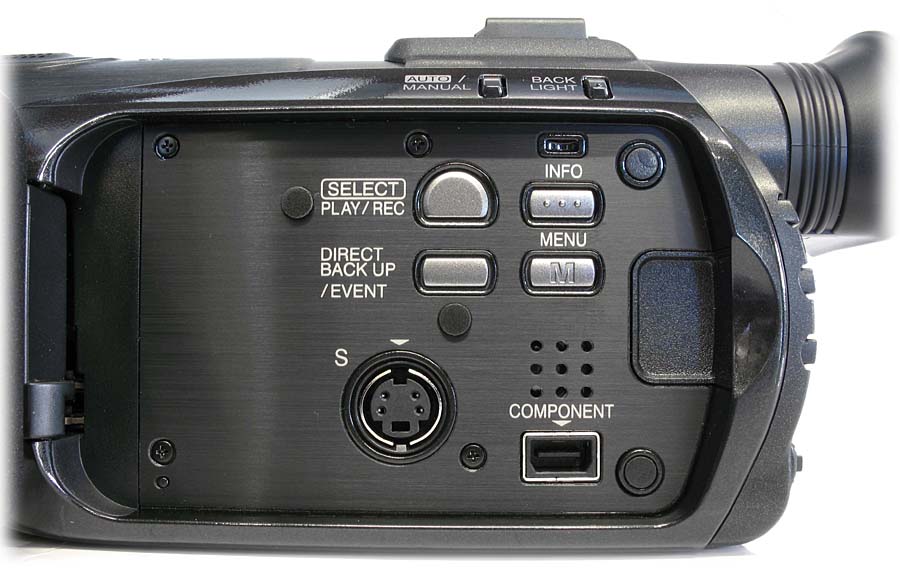 Detail ovládání a zdířek pod LCD (Klikni pro zvětšení)Ploška pod vyklopeným displejem obsahuje dva výstupy - S-Video a COMPONENT - a 4 tlačítka: pro volbu přehrávání SELECT PLAY/REC, INFO k indikaci všech dostupných údajů o natočeném klipu na displeji (pořadové číslo, datum a čas pořízení, délka klipu, kvalita a možnost ochrany proti smazání), dalším pod ním je DIRECT BACK UP/EVENT, po jehož stisku bez vypalovačky lze zatřídit uvažovaný i již natočený klip do kategorií podle uživatele. Je tu 30 profilů ve třech stránkách po 10-ti, přičemž každá další desítka je opakováním s jaksi dodatečným pořadovým číslem (např.) SPORT1/2/3 atd. Hlavní nabídka kamery je proti ostatním kolegyňkám s přízviskem Everio výrazně rozsáhlejší, což se zdá býti logickým (za ty prachy :-D). Po zmáčknutí MENU vyjede jakési skupinové třídění na kategorie VIDEO, STATICKÝ OBRAZ, OBECNÉ, NASTAVENÍ VÝSTUPU (velmi zajímavé!) a MÉDIA; a intuitivním způsobem se do nich vstupuje dál nebo se vrací pomocí pětifunkční páčky (na 4 strany+stisk), výše již zmíněné. Pro fanoušky oboru tedy vyberu odlišnosti od jiných modelů Everio…