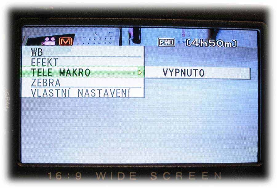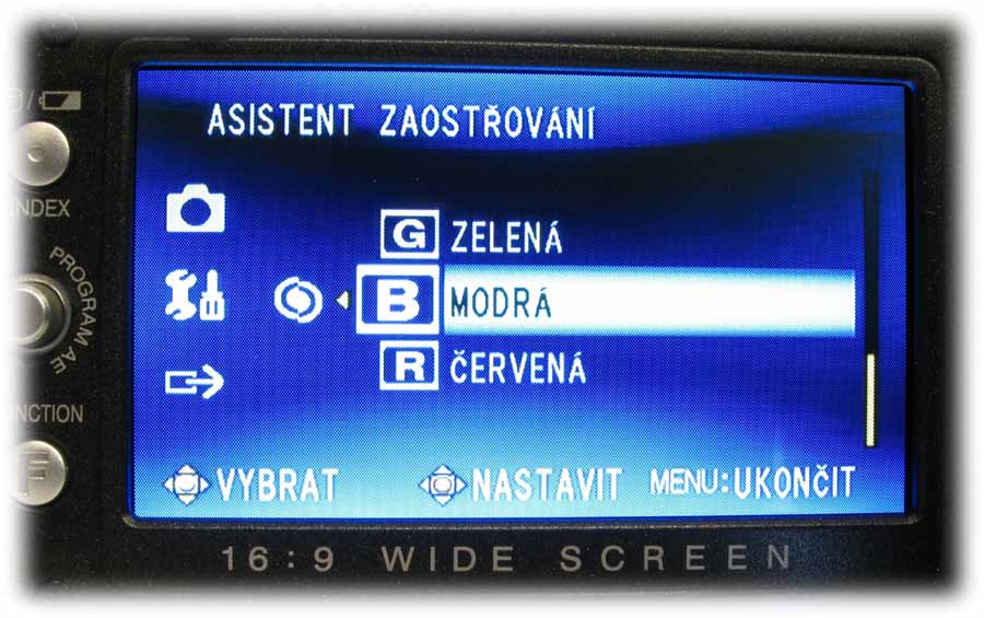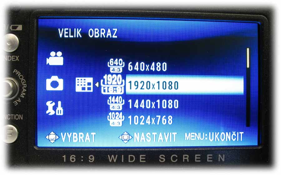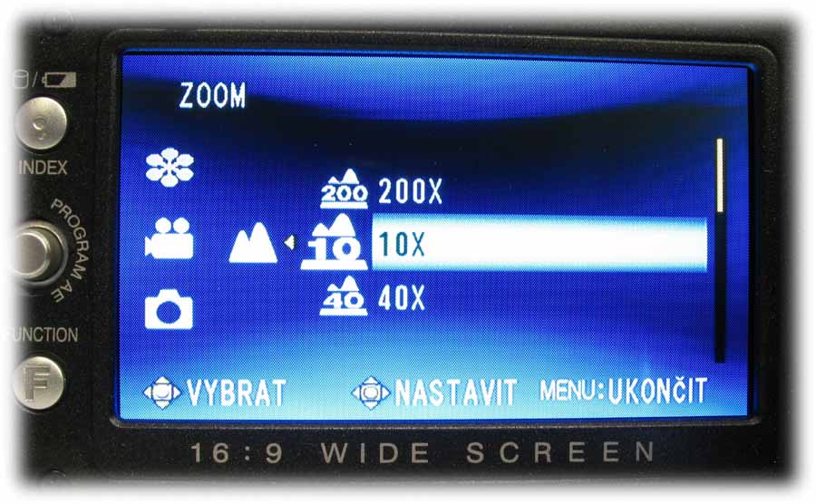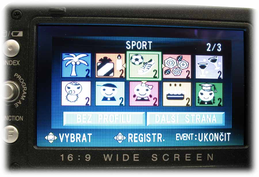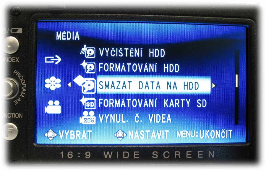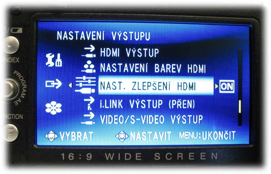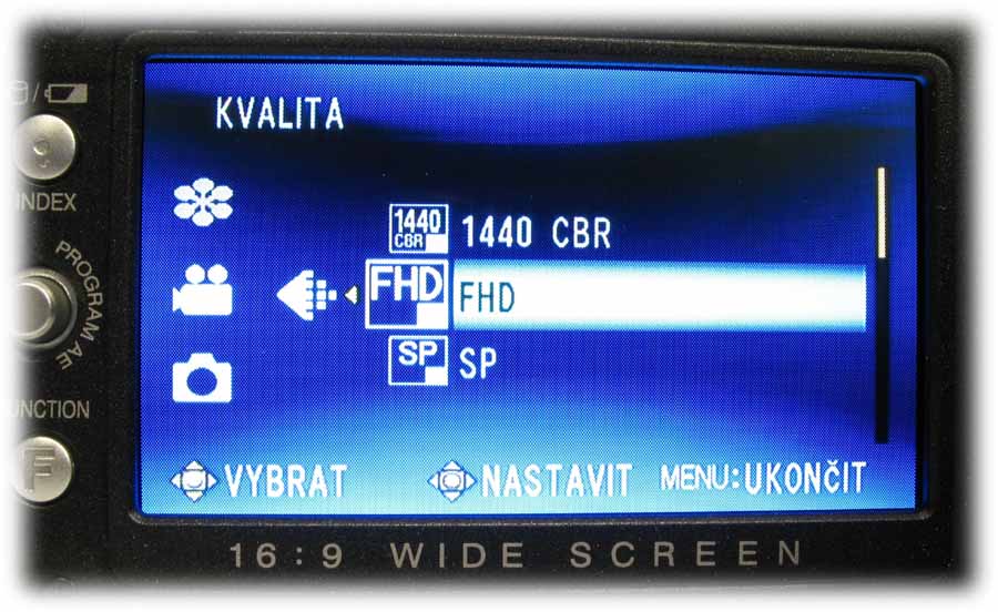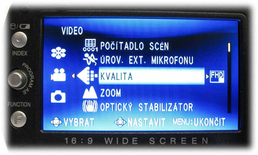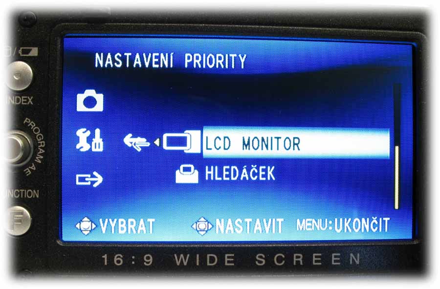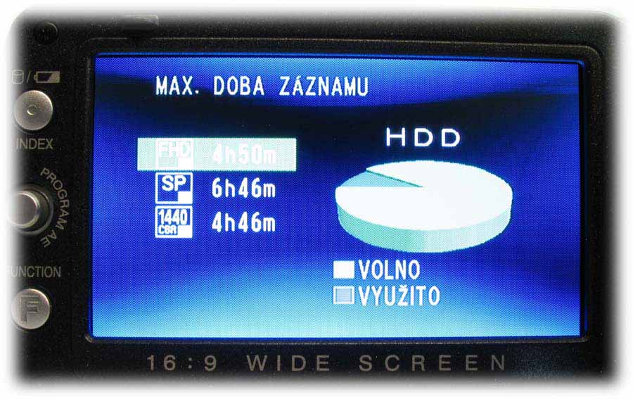 Detail HD7 s otevřeným LCD-panelem (Klikni pro zvětšení)Rámeček LCD-panelu je osazen na levém okraji informačním tlačítkem o stavu akumulátoru i při vypnuté kameře anebo možnostech naplnění pevného disku ve třech různých režimech kvality (viz též dále) a už zaplněnou kapacitou HDD. Počítáme-li míru od středu ke středu, nachází se tu o 12 mm níže pětifunkční element k orientaci v hlavní nabídce i pomocných volbách NIGHT a expozičních programů PROGRAM AE (tam mi chybí bodové světlo: postupně je tu PORTRÉT, SPORT, SNÍH, PROTISVěTLO, SOUMRAK a VYPNUTO). Dalších 12 mm dolů je pak FUNCTION, po jehož aktivaci vyjede nabídka WB (balance bílé, AUTO, MAN. VYVÁŽ., SLUNEčNO a ZATAŽENO plus HALOGEN), EFEKT (zde vypnut nebo SÉPIE, MONOTON, KLASICKÝ a STROBOSKOP), TELE MAKRO (vypnuto/zapnuto), ZEBRA (vypnuto a 70 nebo 100%) a VLASTNÍ NASTAVENÍ, kde se řídí úroveň ostrosti obrazu a nechá zapnout i BAREVNÝ PRUH, což jsou možnosti na amatérskou třídu opravdu (!) nevídané. Vzhledem k rozsáhlosti hlavní nabídky kamery se u popisu MENU v dalších odstavcích omezím na obrázky a k nim přidám postřehy podle svého názoru zajímavé. Pojďme kouknout pod LCD-panel…