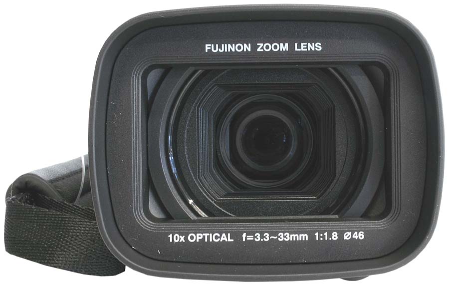 Detail fešného objektivu FUJINON (Klikni pro zvětšení)JVC GZ-HD7 váží holá 665 gramů (s akumulátorem a řemenem 750 gr.) a má míry 91 x 77 x 186 mm. Za objektivem s 10násobným přiblížením a 200násobným digitálním zvětšením jsou osazeny tři CCD-snímače s úhlopříčkou 1/5" a 570-ti tisíci obrazovými body na každém. Elegantní sluneční clona s nápisem FUJINON ZOOM LENS skrývá průměr závitu pro doplňky 43mm; a rozsah je 3.3-33 mm, s tradiční nedostupností čísel tzv. přepočtů na kinofilm. Z prvních upoutávek zaujme u HD7 deklarace vymoženosti optické stabilizace obrazu a k detailům objektivu si sem ještě přidám praktickou vestavěnou krytku s poněkud stísněným páčkovým ovládáním zprava těsně nad úchytem zápěstního řemínku. Napájení přístroje tvoří ze základní sady akumulátor s firemním názvem BN-VF815U a kapacitou 1.460mAh (viz dál). Hledáček s výsuvným okulárem (!) a gumovou očnicí je barevný, má 0,57" a úctyhodných 269kPx, v širokoúhlém LCD-panelu je přehledný displej s 207.000 body a mírou 2,7 palce. Vestavěný pevný disk má kapacitu 60GB a pojme až 5 hodin videa v nejvyšším módu FHD. Po suchém výčtu základních údajů pojďme na prohlídku exkurzním způsobem…