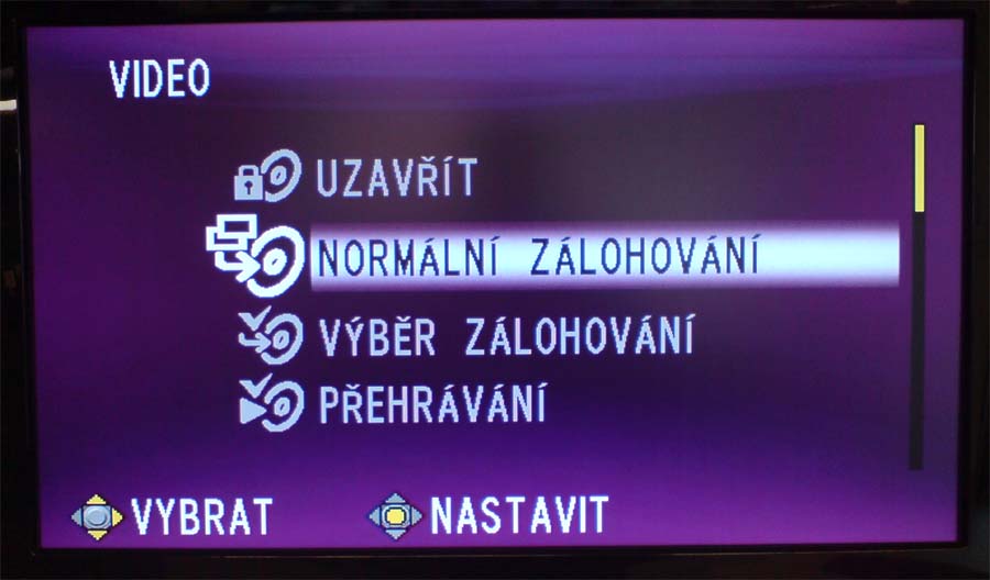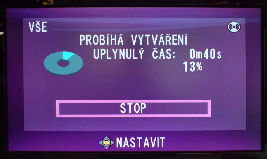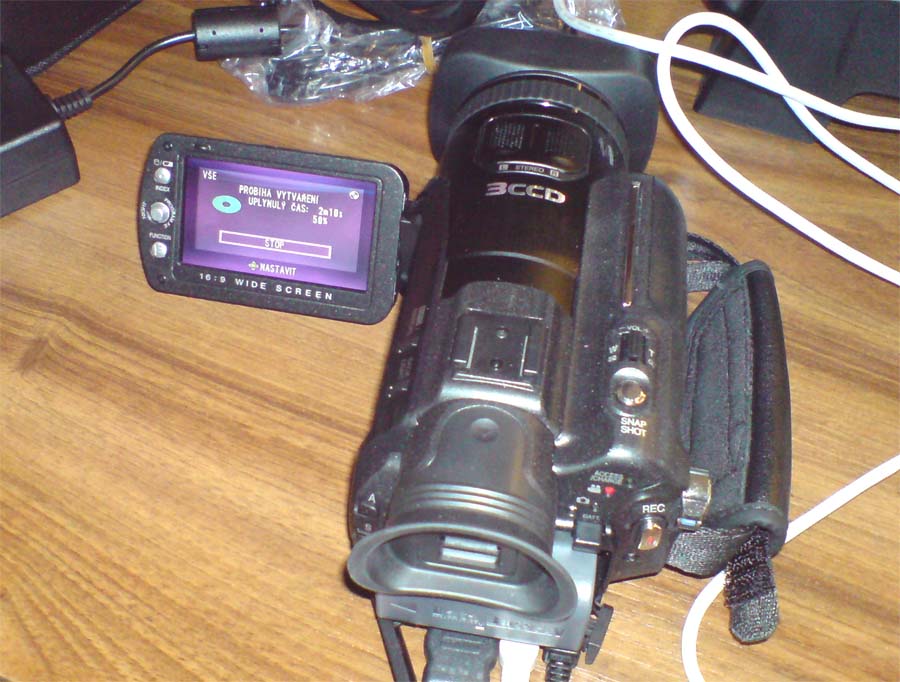 Vypalovačka CU-VD40 pro HD7 (Klikni pro zvětšení)Přestože někteří diskutéři mi asi neodsouhlasí kacířskou (?) myšlenku vypalování Full-HD na běžné DVD-disky, musím je ubezpečit, že CU-VD40 (čs. WEB) to opravdu (kupodivu?) UMÍ: evidentně sice vypaluje HD-klipy "jen jako data" - což znamená NE-kompatibilní s běžnými domácími DVD-přehrávači - ale i tak se s uvedenou vypalovačkou stává HD-7 nyní jediným přístrojem na trhu, jenž nevyžaduje žádné novoty typu Blue-Ray a podobné neprobádanosti. Po připojení (snímky z K800i) DVD-vypalovačky (o níž je i aktualita) jsme proceduru vypalování řídili na LCD-TV přímo z kamery. Celkový čas klipů 18:18 minut zapisovala VD40 cca 5 minut a poté ještě asi 2 minuty disk uzavírala. Po volbě přehrávání na připojené LCD-televizi Acer s HD-rozlišením až 1920x1080 přehrála sice bez zastavení celý disk, ale s cuknutími mezi scénami (zlomky vteřiny). To se zase neděje při reprodukci přímo z kamery, ale ta vždy přehrála jeden den natáčení - třeba i s 10-ti sekvencemi - a chtěla k další činnosti pohladit, jeden cukřík a znovu zvolit PLAY (:-D). Zmíněná délka klipů představovala dle PC-prohlížeče 2,25GB dat; a tady je další rozpačitost. Je-li totiž datový tok v maximu kvality HD7 až ke 30Mbps, měla by tvořit za každou vteřinu videa asi 4MB dat: jenže disk nebyl plný více, než zhruba z poloviny! Matematické operace evidentních nesrovnalostí (ano, točeno FHD), resp. pojmy kolem HD nechme na čtenáři a slibme, že se k tématu na stránkách vrátíme…
