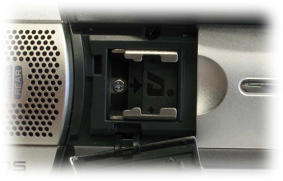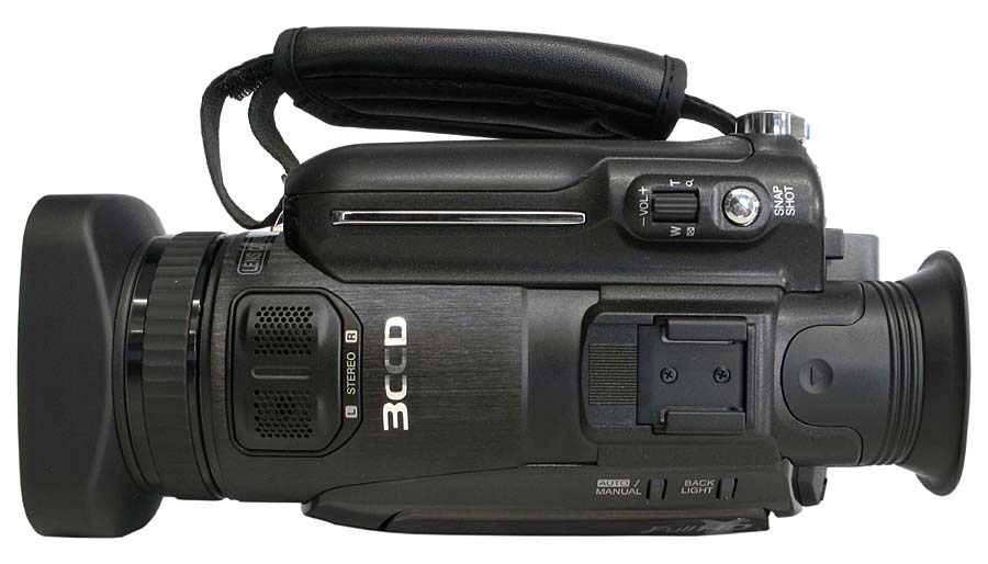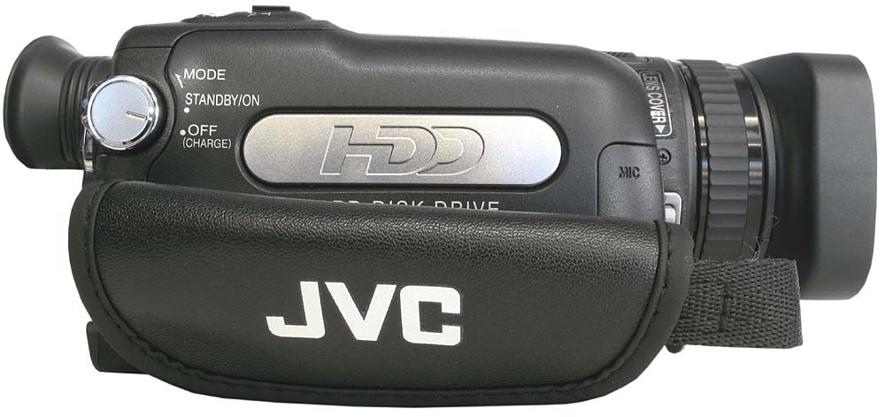 Protáhlá boční silueta JVC HD7 je IN (Klikni pro zvětšení)Zleva má JVC HD7 velmi dlouhou siluetu, jejíž protáhlost je umocněna černým lakem těla a dojem luxusu dotváří stříbrné logoprinty JVC a HDD na vnějším krytu LCD. Za mohutnou clonou je umístěn prstenec manuálního ostření a hned za ním jsou nahoře vestavěné stereomikrofony L-R. Z levého dolního okraje o kousek vyčnívá výstupek funkcí FOCUS ASSIST (viz dál) s aktivací ručního ostření a spodní hrana těla přístroje pod objektivem je doplněna vysouvací krytkou se slotem na SD-karty. Nad horním rámečkem LCD-panelu jsou ještě tlačítka AUTO/MANUAL a BACK LIGHT, čili kompenzace protisvětla; a kousíček nad nimi je velepraktický dílek pro všechny doplňkůchtivé fanoušky - totiž univerzální botka příslušenství, jež neomezí - oproti Sony - nasazení běžných potřebností, jež mohou přicházet v úvahu. Umístění botky je také domyšleno, protože zadní poloha obvykle zabrání zasahování např. externích mikráků do záběru. Povytažený okulár hledáčku odhalí malou páčku případné korekce dioptrického stavu kameramanova oka a my můžeme přejít na další stranu mašinky, poodkrývat její (velmi fešné!) zadní linie…