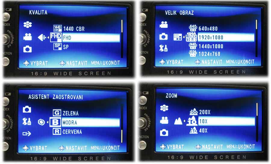 čtyři z nabídek JVC HD7 pohromadě (Klikni pro zvětšení)Kvalita záznamu má tři módy neboli stupně kvality: FHD (že by Full High Definition?) coby volbu maxima toku dat s VBR a rozlišením 1.920x1.080, další 1140 CBR na videoklipy ve vysokém rozlišení 1.440x1.080 s CBR (konstantní rychlostí toku dat) a nakonec ještě SP-režim pro poměr 1.440x1.080 a variabilní přenosovou rychlostí VBR. V kolonce ZOOM jsou volbami 10x a digitálně 40x nebo 200x a posledním odlišením od spotřebnějších modelů je možnost ÚROV. EXT. MIKROFONU (ON/OFF). V části Fotografování (tj. STATICKÝ OBRAZ) je zajímavostí například nastavení citlivosti ISO (kromě AUTO lze volit 100-200-400), variantní SÉRIOVÉ SNÍMÁNÍ (dokonce s možností různé doby expozice) a SAMOSPOUŠ na 2 nebo 10 vteřin. V oddíle OBECNÉ lze kromě jiného nastavit jas displeje, vypnout gravitační ochranu proti pádu (např. pro sebevražedné kusy zvané parašutismus :-D) a zvolit barvu zajímavé funkce ASISTENT ZAOSTřOVÁNÍ modrá-zelená-červená (!); a to pomocí již výše ve 3. odstavci zmíněného předního tlačítka FOCUS ASSIST…