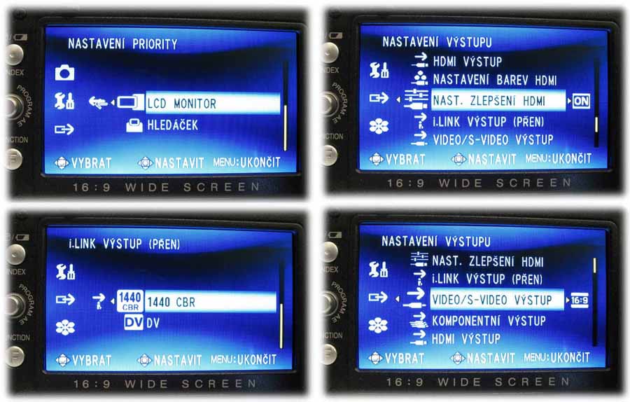 Další čtyři z nabídek JVC HD7 (Klikni pro zvětšení)Mimo PRIORITY hledáček-LCD a pak zobrazení údajů na obou displejích anebo TV-obrazovkách je OBECNÉ vyčerpáno a joystick může skočit vlevo na výstupy. Tady lze volit různé parametry dostupných zdířek; obrázky napoví: mimo jiné si uživatel může nechat téci signál z S-Video jako 16:9 nebo 4:3, z komponentního výstupu lze dostat 576i nebo 1080i, z i-LINK výstupu (F-W - tj. IEEE1394) lze tahat 1440 CBR anebo DV a podobně. Posledním oddílem nabídky je tady skupina MÉDIA, v níž lze najít obdobu defragmentace disku s označením VYčIŠTěNÍ HDD, formátovat HDD, smazat data bez formátování, provádět totéž s paměovou kartou, vynulovat soubory atd. Myslím, že přístroj je konečně už zevrubně popsán a doprovodné obrázky napoví. My se můžeme plynule přenést na zkoušení vlastního natáčení, tedy k primární činnosti, kvůli které se šikmoocí kamarádi daleko za oceánem snažili cosi stvořit; a myslím, že to nadmíru zajímavé technické dílko jim ostudu neudělá. Akumulátor mám plně nabitý (ukazuje po stisku patřičného tlačítka 70 minut s LCD a 80 min. s hledáčkem) a jdu na to…