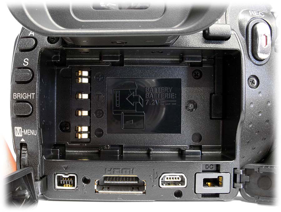 Zadní detail ovládání a AKU-prostoru (Klikni pro zvětšení)Vlevo vedle uložení již zmíněného akumulátoru jsou čtyři ovládátka: tlačítka A, S, BRIGHT a třífunkční čudlík (nahoru-dolů-zatlačit) M-MENU, jež může být na první pohled pochopen jako k orientaci v hlavní nabídce MENU, ale… Už první vyzkoušení ovládátka odhalí žádnou erekci (jo pardon, reakci :-D) v souvislosti s MENU, protože proti logice označení stanovuje jen hodnoty pro 3 výše zmíněná tlačítka: tedy pro (nahoře) A coby nastavení priority clony, druhé S jako volbu rychlosti závěrky a třetí BRIGHT pak jas EV (-6 až +6 v režimu video a -2 až +2 ve fotu). Vpravo vedle akumulátoru (nebo spíše nad ním) je mechanická západka jeho uvolnění a palcové ovládání hlavního vypínače i na volbu režimů video/foto (přehrávání se aktivuje pod LCD - viz popis dále) - samozřejmě pro zapnutí kamery s nutností povytáhnout tubus hledáčkového okuláru nebo otevřít LCD (je to Victor). Nad trojicí malých kontrolek zmíněných režimů s indikací připravenosti disku (nebo kontrolou nabíjení baterie v tomto režimu kamery vestavěnou nabíječkou) je foto-spouš SNAP SHOT a vcelku rozumně citlivá kolébečka transfokátoru. Pravá strana obsahuje už jen zmiňované zavírání pro objektiv a krytku zdířek exterňáku MIC a AV-výstupu. Jděme k displeji…