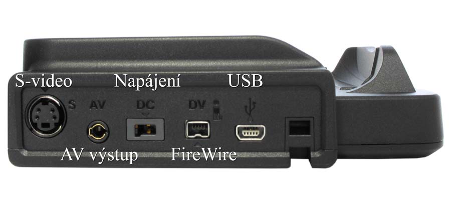 Nutno připomenout, že videozáznam je také možné ukládat na paměovou kartu SD, jejíž slot je ukryt pod dvířky na spodní straně kamerky vedle stativového závitu. Jinak v základním úsporném režimu kamera snímá 25 celých snímků za vteřinu 25p a v dalších třech režimech je záznam v prokládaném režimu 50i. Data je pak možné přenést do počítače přes port USB 2.0 (hodinový záznam v nejlepším Extra jemném módu pak zabírá zhruba 4 GB a do PC je přenesen za cca 7 minut). U modelu MG135 je přes dokovací stanici možný přenos přes FireWire výstup IEEE1394. Ten se rozhodně vyplatí i pro kopírování do DVD rekordéru, jelikož drtivá většina rekordérů používá pro digitální přenos právě FireWire, nikoli USB. Přístroj je ale samozřejmě vybaven i klasickým analogovým výstupem v provedení 3,5 mm čtyřpólový jack a v dodávce uživatel najde kabel se třemi konektory CINCH pro připojení do TV apod. Typ MG135 pak díky dokovací stanici nabízí i S-video výstup…