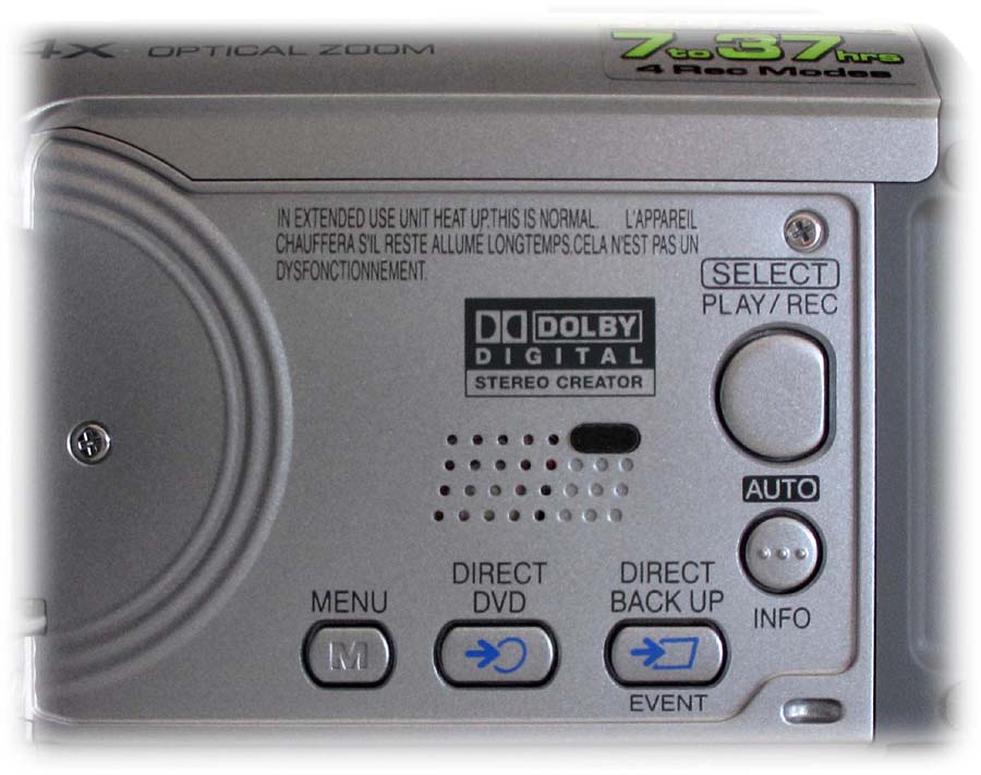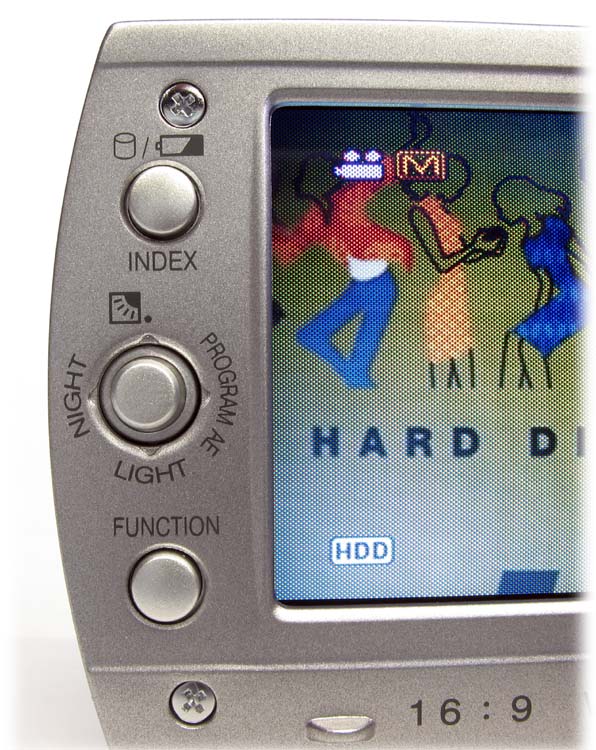 Všechna další tlačítka jsou umístěna buď pod displejem nebo na rámu LCD. Pod výklopným panelem je už zmíněný přepínač Nahrávání a přehrávání, volič režimů ruční vs. automatická nastavení AUTO, tlačítko vstupu do MENU a duo tlačítek DIRECT DVD a DIRECT BACK UP (ta jsou určena k vypalování neboli zálohování videí na vypalovačce i bez použití PC). Na vyklopeném LCD, resp. vlevo od obrazovky jsou dvě tlačítka a pěti-směrný ovládací joystick. První horní tlačítko zde slouží pro vyobrazení informace o nabíjeném akumulátoru (stav dobíjení) - při zapnuté kameře kamera zobrazí údaj o volném místě na disku a v přehrávacím režimu potom tlačítko slouží pro vyhledávání souborů/záznamu (Index). Druhé tlačítko FUNCTION otevře nabídku menu, v níž lze nastavit následující parametry: manuální ostření, expozici, rychlost závěrky (1/2s-1/4000s), vyvážení bílé barvy - automatika, plný manuál, slunečno, zataženo a umělé osvětlení/halogen; a pak jsou tu 4 OBRAZOVÉ EFEKTY: sépie, monotón, klasický film a stroboskop. Jako poslední uvádí výrobce TELE MAKRO, což je možnost i zblízka najet na detail, aniž by kamera měla problém s ostřením…