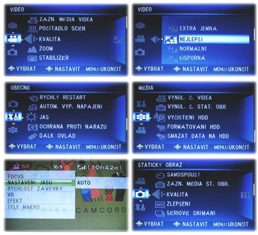 V části STATICKÝ OBRAZ si volíme kvalitu/kompresi fotografií (rozlišení VGA - 640x480), samospouš (10 vteřin) nebo možnost sériového snímání; a je tu rovněž možnost volby ukládání dat na SD kartu nebo pevný disk. Do sekce OBECNÉ sem vložil výrobce standardní nastavování data a času, jasu LCD panelu, vypnutí senzoru dálkového ovladače, nastavení zvuku operací a nastavení jazyka. Jak jsme si u diskových kamer zvykli, jsou vybaveny ochranou proti nárazu, takže v případě, že je kamera zapnutá a došlo by k pádu, přístroj bleskurychle (a automaticky) vypne a tím předejde poškození disku. Optika a další elektronika je však stejně náchylná, jako u běžné kamery, takže se i tak doporučuje s kamerou zacházet s velkou opatrností. Poslední část MÉDIA umožní formátování HDD nebo paměové karty a podobně tak nabízí nulování počítadla pro video a fotografie. Je zde navíc položka označená jako Vyčištění HDD a v návodu je o ní napsáno následující: Po delší době opakovaného používání se u záznamového média projevuje tendence zpomalení rychlosti zápisu. Pro obnovení rychlosti zápisu provádějte čištění periodicky. Snad se to dá chápat coby defragmentace disku jako u pécéčka…
