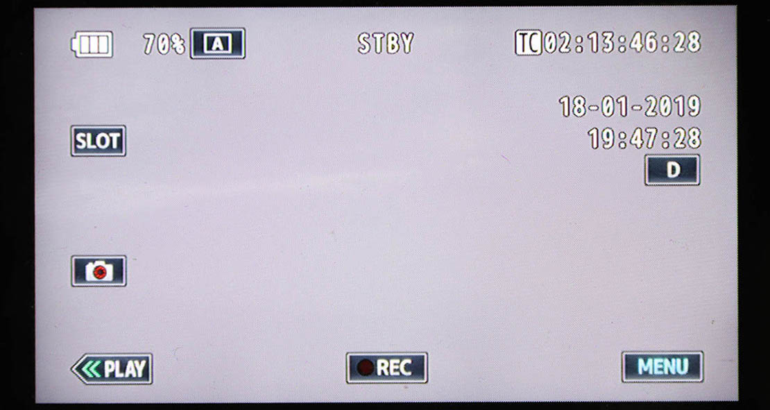 ERGONOMIE VIDEOKAMERY. Kolíbka zoomu je kapku jinak položená oproti jiným strojkům, ale myslím, že do tolerance se 980tka i přes kapku ekvilibristické ohýbání palce pro spoušť vejde. Palcem se totiž musí dosáhnout i při držení jednou rukou; a to jsem si radši odpustil. Přidržování vyklopeného displeje levičkou je pro stabilitu záběrů HODNĚ praktické. VŠECHNO další je pro celkové zvládnutí vlastního přístroje - jak se čtenář dozvídá výše - v nabídkách pod maličkou aktivační ikonkou MENU vpravo dole na displeji (viz zde níže). Uprostřed LCD dole je malá ploška REC a vlevo šipka s dvěma zelenými hroty PLAY. V obrazovce pak nechybí ikonky Foto-režimu, volby slotu a potřebné údaje o akumulátoru, počítadle délky klipů i data a času. Pro tuto recenzi a zkoušení si hraji s černým „válcem“ už několik dní; a musím uznat, že moje původní (ne zásadní) nedůvěra ve výdrž akumulátoru postupně mizí…