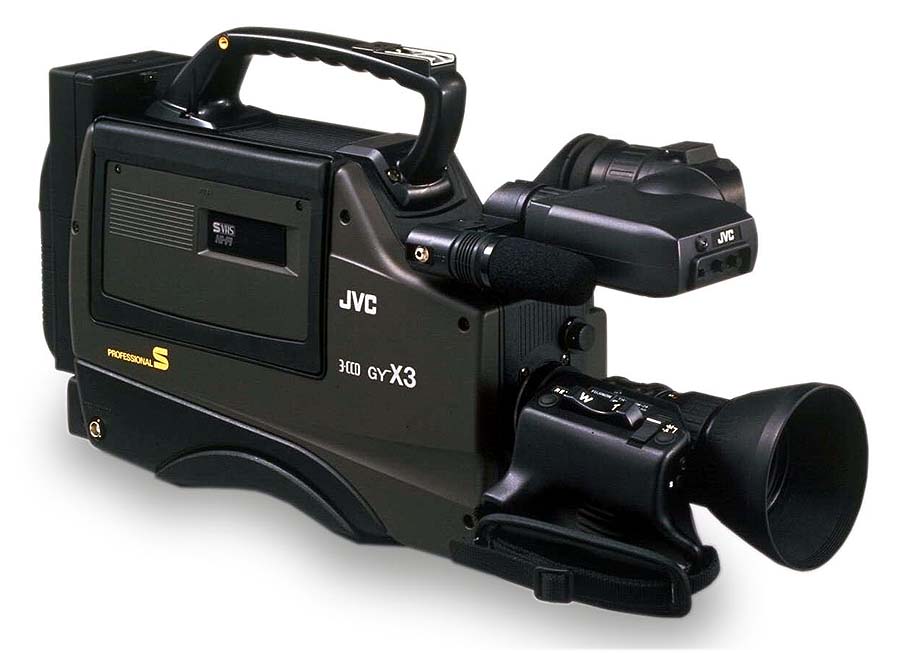 Mrkněme se nyní na další značku, jež nabízela profesionálnější přístroje v analogové éře: totiž JVC. Využijeme-li zde (výjimečně) komerčních podkladů od stálého čtenáře, je tu zajímavý stroj S-VHS od Victora z roku 1993, mimochodem i s příslušenstvím zrovna na prodej. Velký tříčip KY17E pracoval s plným formátem S-VHS-pásky a kromě množství manuálních funkcí má zjevně i možnost výměny objektivů. Složitá konstrukce nebo pohled na náročnost (!) manuálního ovládání asi neosloví žádné zájemce z řad dnešních (či budoucích?) spotřebních kameramanů, ale při odezírání obrázků naznačí čtenářům, o čem že to ten autor dnešního textu vlastně píše. XLR-konektory pro mikrofony, manuální prstence na objektivu, masivní tubus okuláru hledáčku nebo impozantní velikost vlastního těla videokamery napoví každému zvědavci, že tohle nebude žádné tintítko. Stejnou firmu tu připomeňme ještě jednou: fešný tříčip (3x 1/3") S-VHS snad stojí za snímeček do tohoto povídání a impozantní typ GY-X3 takovým určitě být může. Krásný ramenní přístroj z (takřka současné) doznívající éry těchto videokamer má taktéž mechaniku na velkou kazetu S-VHS, podobně jako takto zařízené strojovny firmy Panasonic…