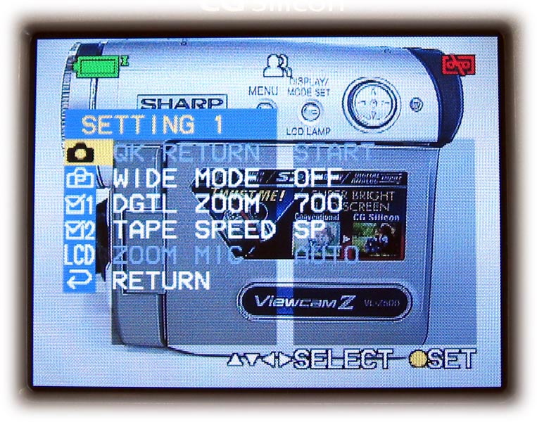 V Menu videokamery jsem nenašel nic neobvyklého, co by jiný výrobce nenabízel a ani nic mi tu nechybělo. Ze standardních věcí bych zde jmenoval možnost vypnutí stabilizátoru obrazu či digitálního zoomu, volbu LP/SP rychlosti záznamu, 12/16 bitový záznam zvuku, nastavení jasu a barevnosti hledáčku a LCD panelu či třeba nastavení data a času. Jednou ze zajímavých položek je možnost vyřazení tzv. automatického vypínání kamery po obvyklých pěti minutách při vložené kazetě. Přístroj má samozřejmě také možnost volby manuálního ostření, dále i nastavení bílé barvy - kde nalezneme přednastavené režimy pro vnitřní a venkovní zdroj světla - a pak rovněž možnost manuální volby bílé. Celkem netradiční je schopnost nastavení clony od f1.8 do f19. Udávaná rychlost závěrky je od 1/12s do 1/10000s. Pokud ale není uživatel příznivcem manuálních režimů a navíc není ani spokojen s plnou automatikou, může zvolit některý z přednastavených nahrávacích režimu (sport, západ slunce, party, apod.). Pro noční natáčení je možné aktivovat LED-diodu; a kdo fandí obrazovým efektům, najde v přístroji 4 základní: černobílý obraz, sepia, solarizace a negativ)…