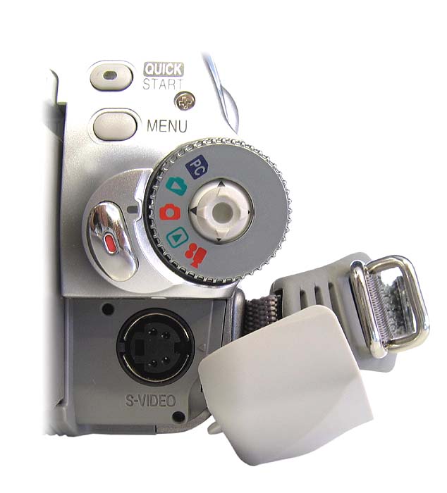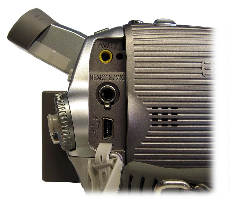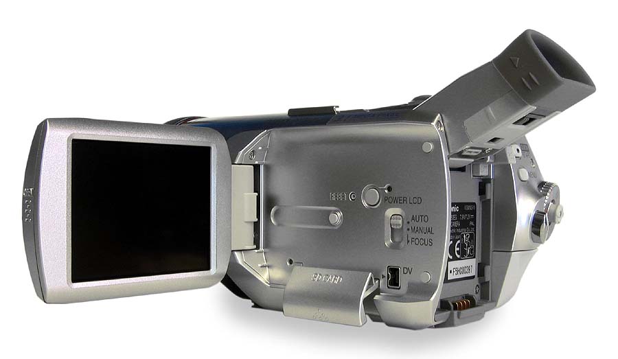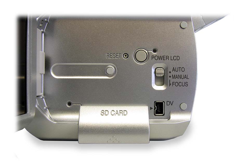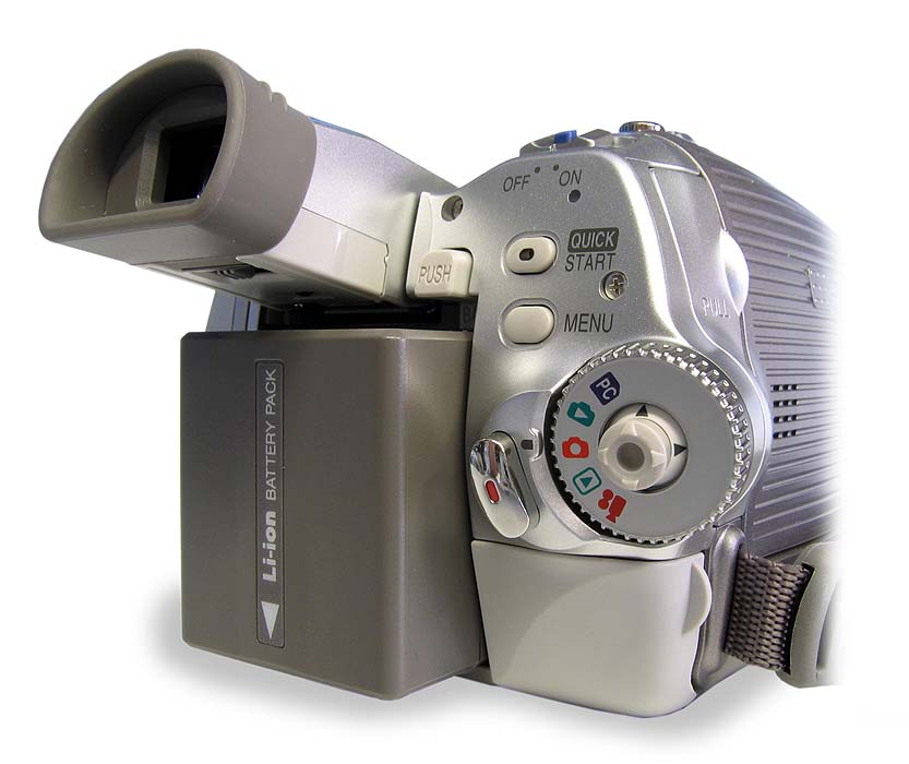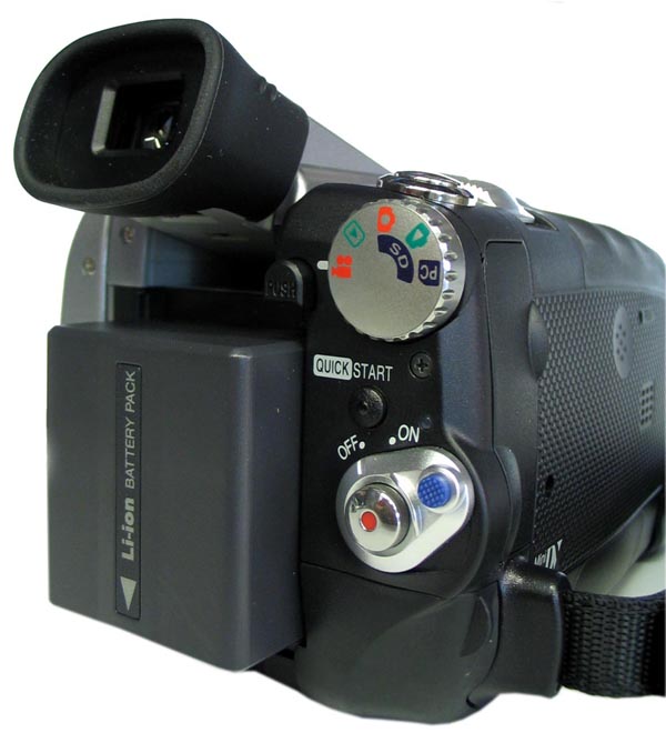 Tlačítka pro levou ruku v podstatě téměř neexistují, vše je zde na prsty pravé ruky včetně video-spouště a se zmiňovanou výjimkou vstupu do hlavního MENU. Pod LCD-panelem je tady pouze volba intenzity displeje POWER LCD, mazací ďolíček RESET a přepínač manuálního ostření AUTO-MANUAL-FOCUS, kde je malým posunutím do nearetované polohy FOCUS zaostřeno například po najetí na detail automatikou se současným ponecháním v manuálním módu. Nad spouští a tlačítkem MENU je volba QUICK START, která má za úkol aktivovat činnost přístroje z jakéhosi napůl zapnutého stavu velmi rychle (1,7sec.) do úplné pohotovosti k nahrávání. Tento rychlý start mimochodem nefunguje bez vložené videokazety v přístroji. Posuvný volič najetí na záběr W-T (ZOOM) funguje v přehrávacím režimu videokamery jako ovládání hlasitosti vestavěného mini-reproduktorku, který se vývojářům podařilo umístit do malé dutinky vyklápěcích dvířek mechaniky kazety zprava. Přípojné zdířky vpravo vzadu, vedle AKU a pod panelem jsou - ty, u nichž to jde - propustné oběma směry (je tu DV- i AV- vstup)…