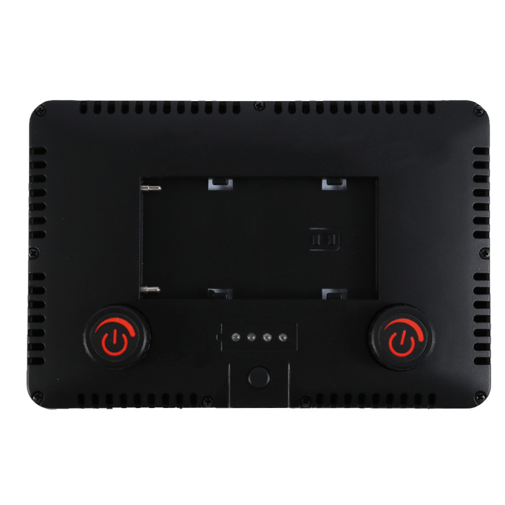 Posledním typem je moderní novinka se 192LED, oproti ostatním popsaným modelům výše "moderně tenký". Pohon obstarává akumulátor NP-F-kové řady Sony, pro případ použití tužkových baterií lze pro ně dokoupit jakýsi domeček. Rozměry jsou 150 x 100 x 15 mm. Jak je vidět na obrázku zde nad textem, na zadní straně jsou dva trimry. Každý z nich ovládá polovinu diod s jinou barevnou teplotou - samozřejmě nikoli rozdělené napříč, ale plošně tak, aby svítilo v celém rámečku střídavě větší intenzitou 96 studenějších diod nebo stejný počet teplejších. Indikátor zbytkové energie je jasně patrný právě mezi oběma regulátory na obrázku vpravo...