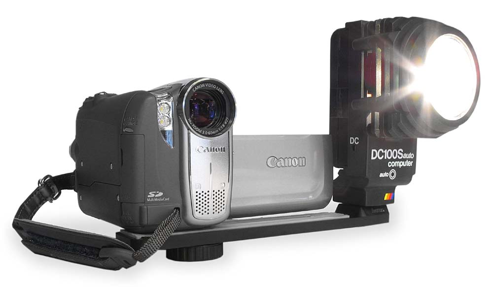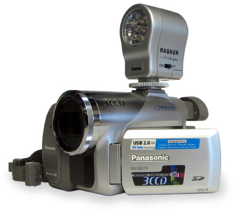 Někdejší plnoformátová VHS-kamera Panasonic s halogenem Halogenové světlo na liště s někdejší páskovkou Canon