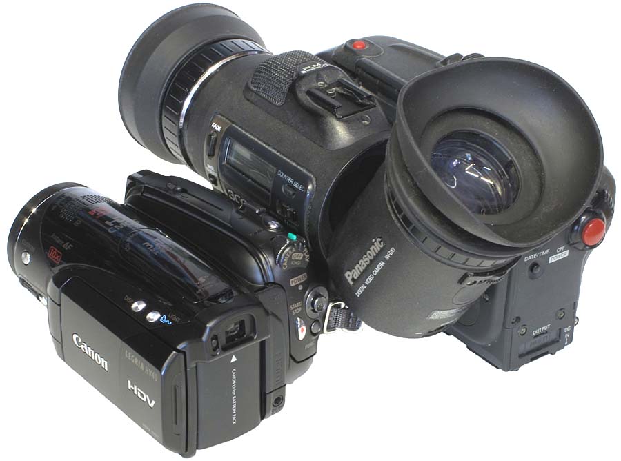 Panasonic NV-DX1 byl první digitál této firmy z r. 1996, rok po startu mini-DV. Srovnání: Panasonic DX1 a Canon HV40 (Kliknutí zvětší)Impozantní tříčip 3x 1/3" s 320kPx má i barevný OBřÍ hledáček 0,7", 10x ZOOM, na objektivu závit 49 mm a úctyhodných 1.1kg. Fanouškům ještě zadní srovnání s Canon HV40 a výzvu: nabídněte své veterány Správci, zaplatí rychle (PJ)...