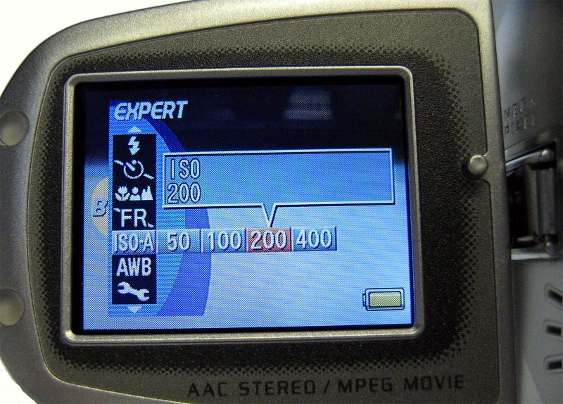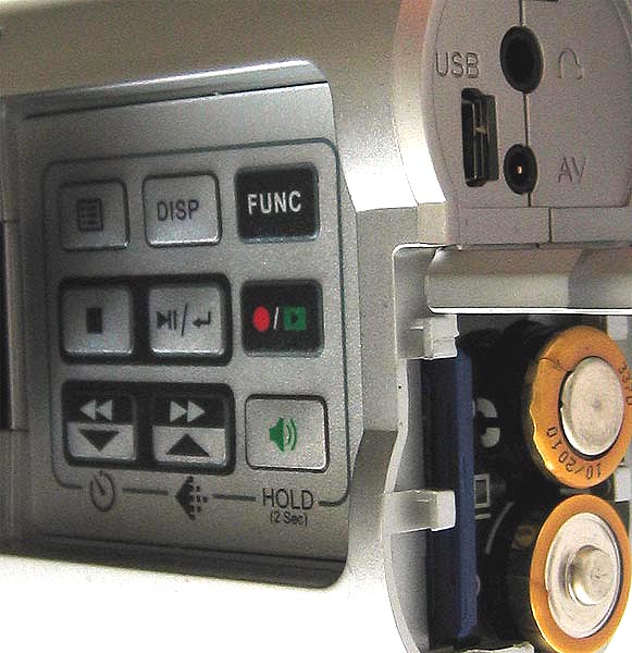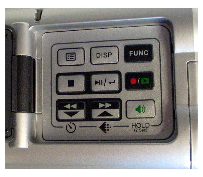 Vlastní ovládání tohoto drobečka je také poplatné uspořádání: Mimo horních tlačítek zapnutí, (digitálního) "transfokátoru" a samotné spouště pro fotografie i video jsou veškeré možnosti přepínání režimů, volby efektů, stupně rozlišení anebo třebas samospouště soustředěny pod LCD-panelem. Vstup do hlavní nabídky je vlevo nahoře a obsahuje od dvou do čtyř stránek tzv. podnabídek podle režimu mašinky, jež jsou zde k dispozici dokonce čtyři: kamera, foák, diktafon a MP3-přehrávač. Tady je nutno poznamenat, že jako poučenější laik jsem zvládal orientaci (jako vždy) bez českého návodu, ale rozhodně to nebylo stejně jednoduché, jako se mi zdálo u další popisované kartovky firmy Sanyo. Nakonec jsem se s tou legrací docela skamarádil a na ovládání si celkem zvykl. Prostřední tlačítko DISP může postupným mačkáním na plochu LCD narýsovat pomocný orientační kříž anebo zobrazovač zcela vypne. Pravým tlačítkem FUNC se provádí volba režimů, jež zůstávají navoleny i po dalším zapnutí přístroje: vypne-li tedy uživatel DV5000 např. jako MP3-player, po zapnutí najede na stejný režim audio-přehrávače MP3. Prostřední řadu tlačítek (shora) tvoří stopovací, přehrávací (pauzovací, potvrzovací) a volba přehrávání videa (zobrazování DF) nebo záznamu (nahrávání) dat. A účel spodní trojice mačkátek je snad vcelku jasný z přiložených snímků: hledání v nabídce nahoru/dolů jsou současně samospouští a volbou rozlišení a symbol reproduktoru umožňuje regulaci hlasitosti, přičemž jeho zmáčknutím na 2 vteřiny se všechna tlačítka vyřadí (či uvolní) z (ne-)činnosti…