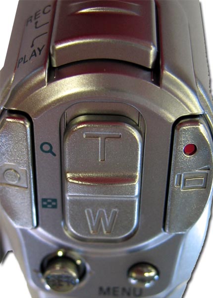 Rozkošný mrňous XACTI C1 má tedy vestavěný CCD-snímač s velkou úhlopříčkou 1/2,7“ a údaji 3,2MPx efektivních, respektive 3,340.000 pixel celkem. Celý přístroj je možno zapínat tlačítkem pod LCD nebo už pouhým vyklopením LCD-panelu, jenž je také menší svým rozměrem 1,5", ale jeví se velice jasným a ostrým - má ostatně i podobný počet bodů jako výrazně větší kamerové panely: 110.000. Už v nedávných aktualitách jsem naznačoval, že každý navolený režim oznamuje dívčí hlas a také jsem naznačil, že se to dá samozřejmě vypnout. Já bych si to při dlouhodobém vlastnictví možná rozmyslel, ale efekt to je jako ušitý na míru všem hračičkům. Mediální popularizátor a sympatický kolega Ondřej Neff sice na svém WEB-u - vedle pasování XACTI C1 na čtyřmegáč - soudil, že se mu zdály zvuky jako "štěbetání, ze kterého nerozuměl jediné zblo", ale já jsem naopak ono dívčino vyslovování „kejmramoud“ nebo „stendbajmoud“ považoval za naprosto srozumitelné. Koncepce ovládání kolibříka je kompletně o palci pravičky - mašinka má dokonce dvě spouště, takže bez nějakého přepínání dovoluje přímo zvolit mód nahrávání uživatelem: buď focení DF nebo nahrávání videa. Horní volič (viz obrázky) pak přepíná nahrávací a přehrávací režim celé kamerky a podle mých poznatků se na něj dá také dosáhnout palcem. Nejvýraznějším prvkem zadní strany je posuvný ovladač transfokátoru, jenž má samozřejmě svou roli i v přehrávacím režimu pro zvětšení fotek nebo jejich náhledy. Digitální zvětšení v nahrávacím režimu - až 10násobek optického - se dá také samozřejmě vypnout (a umí to dokonce až 32x zvětšovat i při přehrávání)…