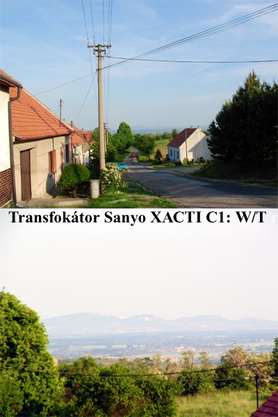 Ergonomie XACTI C1 bude asi docela závislá na velikosti a obratnosti ovládací pravičky uživatele, ale mně se zdála vcelku velmi použitelnou. Svými rozměry 69x38x134 mm i hmotností 170gramů (včetně AKU a karty) jde o jakousi větší obdobu každodenního tréninku s mobilním telefonem (ten tu samozřejmě chybí - šuplík na SIM-kartu :-o)...). Volitelné rozlišení pro fotografování je tu ve třech stupních - 2.048x1.536 bodů, 1.600x1.200 bodů a nejmenší kvalita 640x480 bodů - zatímco video lze zaznamenávat jako VGA (oněch 640x480) nebo 320x240 bodů. Zásadnějším problémem ale pro praktičnost používání bude nejspíše to, že samotná nahrávka má příponu MP4 a bez editace anebo alespoň "protažení" programem je zvláštně nekompatibilní s běžnými přehrávači Windows. Video-ukázka u konce tohoto článku je tedy už převedená do běžnějšího formátu mpg a měla by naznačit i srovnání s méně snímkovací miniaturou Mustek. Pro ukázku foto-režimu (961kB) jsem si bicyklistiky (už v červnu) vystoupal nad brněnskou přehradu a demonstrace širokoúhlého versus plného přiblížení zase pochází z kolo-výletu na (pravděpodobně) největší dohledatelné klesání v čR: porovnání přiblížení je z obce Hlína blízko Rosic u Brna. Mimochodem jsem tam na svém trekku překonal z kopce ve směru na Moravské Bránice (je tam 17%!) rychlost devadesáti kilometrů v hodině (zkoušejícím cyklistům doporučuji vyjet od Neslovic či Prštic a sešoupnout dolů) a kopečky vzadu jsou samozřejmě naše jihomoravské mini-pohoří Pálava…