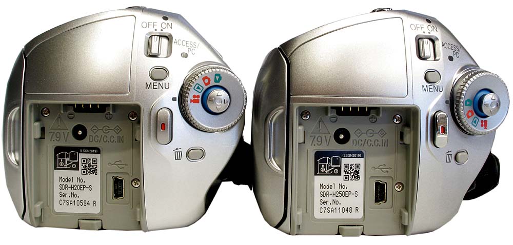 Zadní strany přístrojů jsou pak shodně osazeny základními ovládacími prvky; tj. posuvníky pro zapnutí/vypnutí videokamer, dále multifunkčním joystickem s otočným ovladačem režimů a tlačítky pro nahrávání záznamu, vstupem do nabídky MENU a šedým čudlíkem pro přímé smazání vybrané scény. Vše je doplněno nahoře páčkou transfokátoru a spouští fotoaparátu. I akumulátor má tradiční umístění na zadní straně těla. Jedinou drobnou nevýhodou tu zůstává umístění USB zdířky pro propojení s počítačem, která se ukrývá pod akumulátorem a nutí tak uživatele připojit kameru do sítě, pokud si chce stahovat video, což může být ve chvíli, kdy nemá síový kabel u sebe, neřešitelná situace. Kromě USB-portu je pod krytkou těsně nad AKU-paticí AV výstup pro přímé propojení do televizoru nebo videa. Ani u diskovek Panasonic neustoupil od velepraktické externí nabíječky v základním příslušenství. Akumulátor, jenž dostává uživatel k přístroji v pořizovací sadě, má udanou kapacitu 1150mAh a jeho výdrž je (standard) přibližně na hodinu běžné práce s přístrojem…