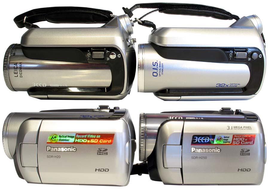 Prvním vjemem, který uživatel z nových kamer má, je určitě vzhled. Již na první pohled je vidět, že diskovky Panasonicu rozhodně nepatří mezi nejmenší: se svými rozměry 83 x 75,8 x 121 mm (ŠxVxH) výrazně převyšují letošní konkurenci. Tomu odpovídá i hmotnost přístrojů, H20 váží 440 g bez akumulátoru a SD karty, H250 přibrala ještě o 20 g více, tzn. na 460 g. Ani s křivkami obou kamer si Panasonic nedal moc práce, oba přístroje působí trochu plastově a lacině; a H20 má dokonce jako jediná z letošních harddiskovek vnější mechanickou krytku. U H250 se snažili na designu trošku více - svým stříbřitým leskem působí elegantněji, krytka objektivu je vestavěná a řešená poměrně originálně otočnou hranou objektivu. Jak jsem již zmínil, levnější z novinek je osazena 1/6" CCD-čipem s 800 tisíci body; a objektiv má ohniskový rozsah 2.3-73.6 mm. Přepočty na kinofilm jsou pak 46.1-461 mm (u 4:3) a 47.1-471 mm (na 16:9) - oba rozsahy pro video - a světelnost tu má hodnoty 1.8-3.7. U H250 jsou osazeny 3CCD-čipy s úhlopříčkami 1/6" a 800kPx a ohniskový rozsah se tak změnil na 3.0 - 30.0 mm (s přepočtem na kinofilm totožným jako u slabší verze), což se samozřejmě projevilo na velikosti optického přiblížení: vyspělejší z obou sester má "pouze" 10násobný ZOOM oproti 32násobku Dvacítky. Světelnost H250 má hodnoty 1.8-2.8 a průměr zavitu na objektivu je u obou shodně 37mm…