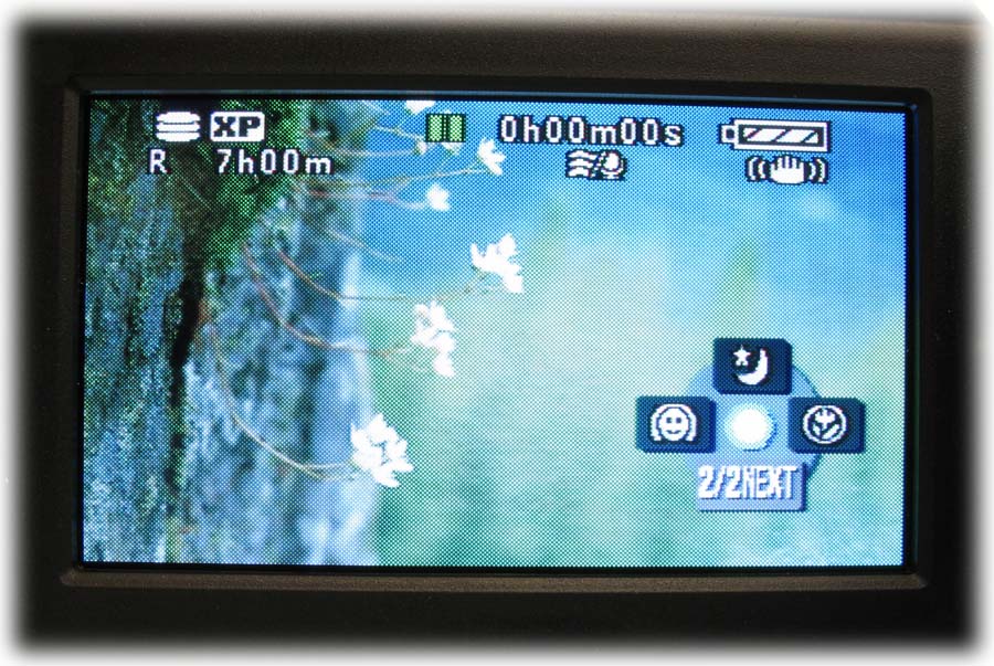 Nabídky voleb MENU, respektive celková ovládání obou popisovaných typů diskovek, jsou velice jednoduchá. Téměř všechny funkce se zvládají pomocí multifunkčního 5směrného joysticku (uprostřed voliče módů), což mi přijde velmi pohodlné - a již po pár minutách se s tím uživatel sžije. Po stisknutí joysticku se zobrazí nabídka dalších funkcí, jako jsou např. kompenzace protisvětla, roztmívání/zatmívání, tzv. Soft skin režim (barva pleti je měkčí a podle výrobce má vypadat lépe), Tele makro (tj. k zaostření s přiblížením objektů) a Barevné noční vidění. V režimu fotografování přibude ještě možnost samospouště a v manuálním módu se dá navíc ovlivnit i vyvažování bílé barvy, rychlost závěrky a velikost clony. Nechybí ani možnost manuálního ostření, které opět probíhá pomocí joyticku. Základní nabídka aktivovaná stiskem tlačítka MENU je rozdělena do pěti skupin a čtenáři se je pokouším představit pomocí přiložených obrázků (Pozn. PJ: nejen nově příchozím připomeňme, že všechny obrázky máme už několik let identifikovány kurzorem PC-myšky a připraveny ke zvětšení kliknutím)…
