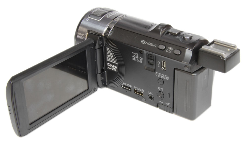 Zadní perspektiva Panasonic HC-V700 s přidavnými saňkami (Kliknutí zvětší)Parametry HC-V700 uváděné výrobcem jsme si již uvedli a tak si je konečně otestujme v praxi. Kamera nemá hledáček, takže hned na začátku musíme vyklopit displej a kameru zapnout příslušným tlačítkem. Doba náběhu odpovídá záznamu na paměové karty, což znamená, že je velmi krátká. Velikostí nepatří V700 mezi nejmenší přístroje na současném trhu, ale aspoň se díky tomu lépe drží i ve větších rukách. Základní ovládání lze zvládnout velmi jednoduše za pomocí tlačítka spouště a páčky zoomu, o vše ostatní se postará Inteligentní Automat . Optická stabilizace obrazu funguje na velmi vysoké úrovni, doplněna je navíc přídavnou elektronickou stabilizací, která se aktivuje na dotykovém displeji. Mezi povedené funkce spadá rozhodně také možnost zvolit v obraze objekt, na který se má kamera zaměřit - tedy zaostřit a nastavit podle něj expozici, a ta se ho poté snaží držet i při pohybu ve snímaném videu...