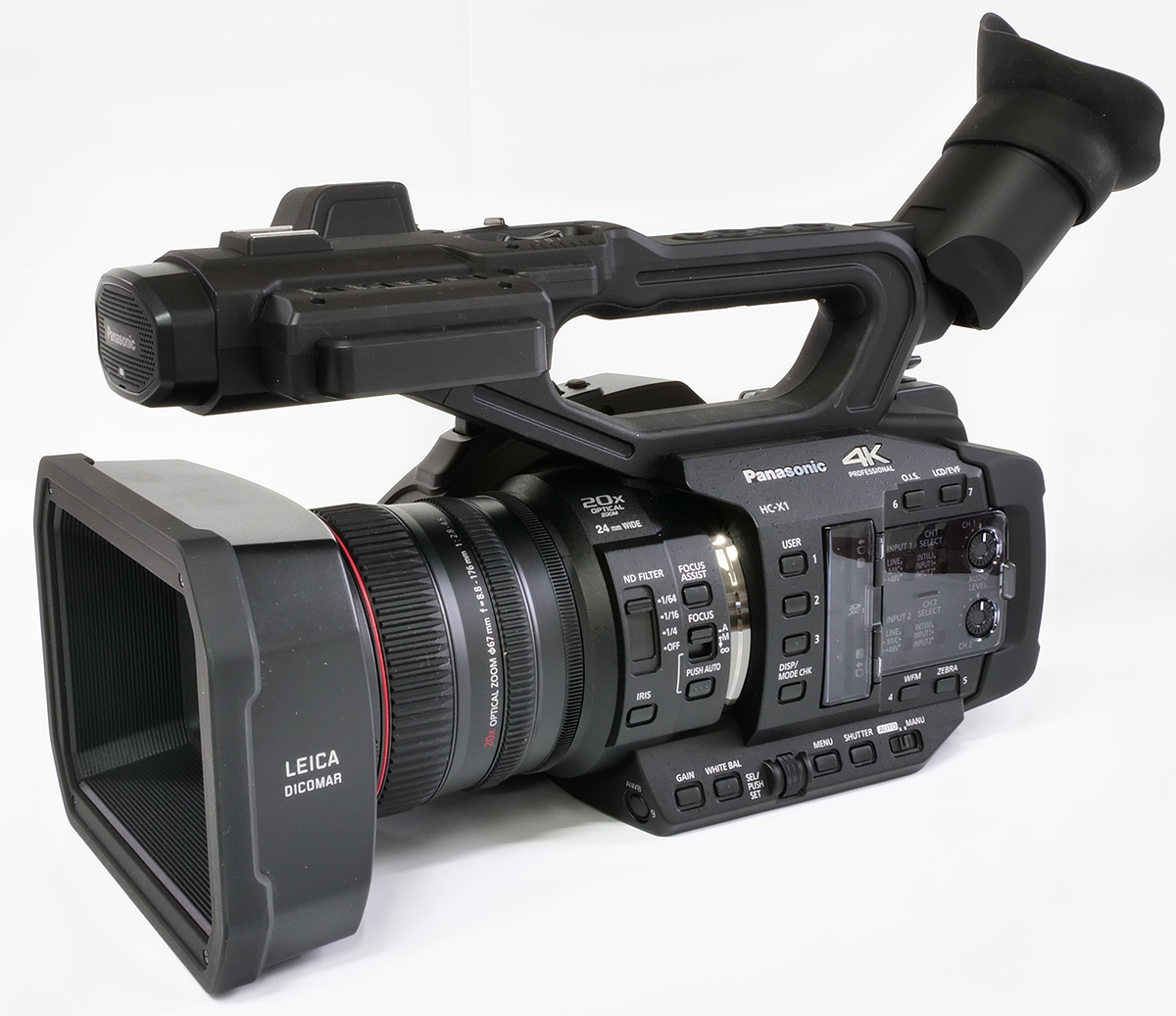 Videokamera Panasonic HC-X1 je masivní poloprofesionální brunetka s mírami 173 x 195 x 346 mm a hmotností 2.000 gramů (bez karty a akumulátoru). Pro srovnání uveďme míry a hmotu XF200, vůči níž by se X-Jednička mohla pasovat: 160 x 201 x 353 mm a 1.510 g. Rozměry tedy velmi podobné; a co do hmotnosti má Panasonic o pořádnou porci větší hodnotu. Objektiv s logem LEICA DICOMAR umí 20násobný optický ZOOM s průběhem ohnisek s tzv. kinofilm-přepočtem 25,4~508 mm (pro 4K pak 24~480 mm). Za soustavou čoček je osazen snímač „typ 1,0“ (13,2 x 8,8 mm) s celkem zhruba 9MPx (viz Web). Pro úplné ovládání manuálních řízení jsou tu vyvedena nejen tzv. zákaznická tlačítka (viz dále), ale hlavně na tělese vlastního objektivu umístěny TŘI prstence manuálů. Profíkům se omlouvám za polopatické osvětlení pro amatéry: zepředu shodně jako u jiných strojů této kategorie je to nejširší rýhované kolečko FOCUS (ostření), dále dozadu ZOOM (transfokátor) a IRIS neboli clona. Obří sluneční clona coby jeden z nejnápadnějších detailů přístroje obsahuje zavírací „vrata“ s trošku jiným uspořádáním, ale v důsledku stejným účinkem, jako to mají profi-mašinky Canon. Průměr závitu na objektivu má veliké číslo 67 mm…