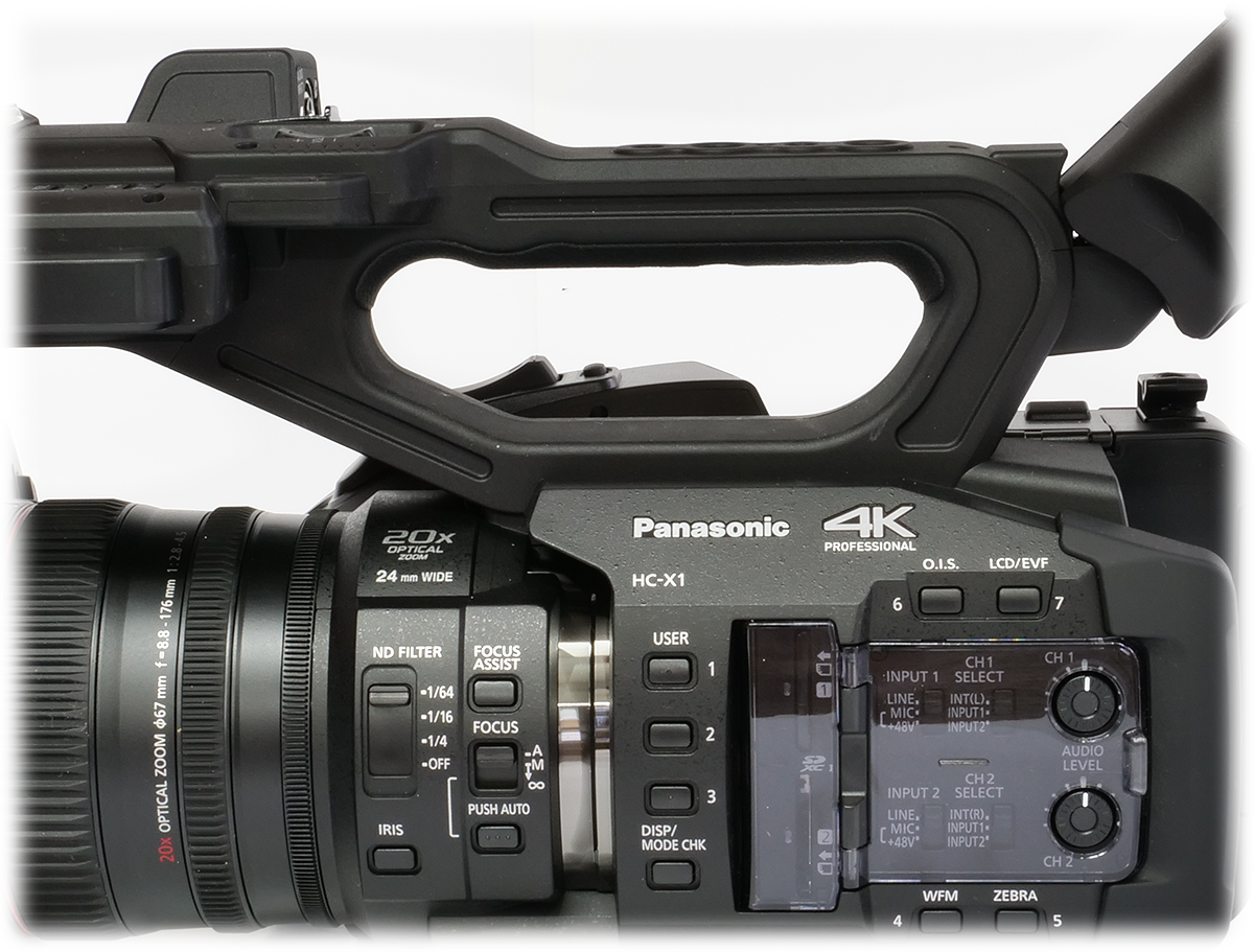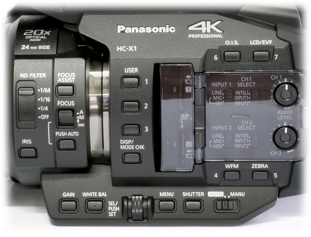 Před zapuštěnou stříbrnou ozdobou, jež odděluje hlavní díl objektivu (< klik) od pokračování těla kamery, jsou ještě čudlíky FOCUS ASSIST (asistent coby přískok na detail při ručním ostření), třípolohový přepínač režimů ostření A/M/∞ a tlačítko PUSH AUTO (jednorázové zaostření s pokračováním manuálu). Kameraman volí plně automatický či plně ruční fokus nebo vyšle zatlačením do polohy se znakem nekonečna patřičný povel optice. Další ovládací prvky směrem dozadu jsou nabíledni: USER neboli uživatelská tlačítka číslo 1 až 3; a DISP/MODE CHK jako volba zobrazení na LCD. Nad audio vrátky z tmavého plastu jsou aktivace stabilizátoru O.I.S. a výběr displeje versus hledáčku - což jsou současně „USER“ 6 a 7 (čtyřka a pětka se nachází pod audio-krytkou). Plastové kouřové krytce, jež se vyklápí na malých pantech zezadu vpřed, předchází užší dvířka pro DVA SD-sloty, která se odklápí stejně dozadu od těla vpřed. Zbývají tlačítka na dolní sešikmené hraně těla: GAIN (řízení zisku), WHITE BAL (balance bílé), SEL/PUSH SET (třícestný joystick pro ovládání v Nabídce, MENU (ona Nabídka), SHUTTER (řízení expozice) a přepínač AUTO/MANU (jasné, že jo Usmívající se). K dokončení všech viditelných prvků (nikoli pod „plexisklem“) zbývá WFM a ZEBRA čili USER 4 a 5. Zatímco ZEBRA je funkcí s jasnou indikací přepálených míst ve scénách, zkratku WFM se výrobce nepokouší ozřejmit ani v českém návodu. Já to kdysi popsal v recenzi XF300 a vysvětlil dle dostupných informací jako (kopíruji ze svého článku) WFM je Waveform monitor či Vectorscope a jinak Edge monitor a vizuálně to lze popsat nejlépe jako zkušební testovací barevné pruhy za koncem vysílání…